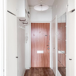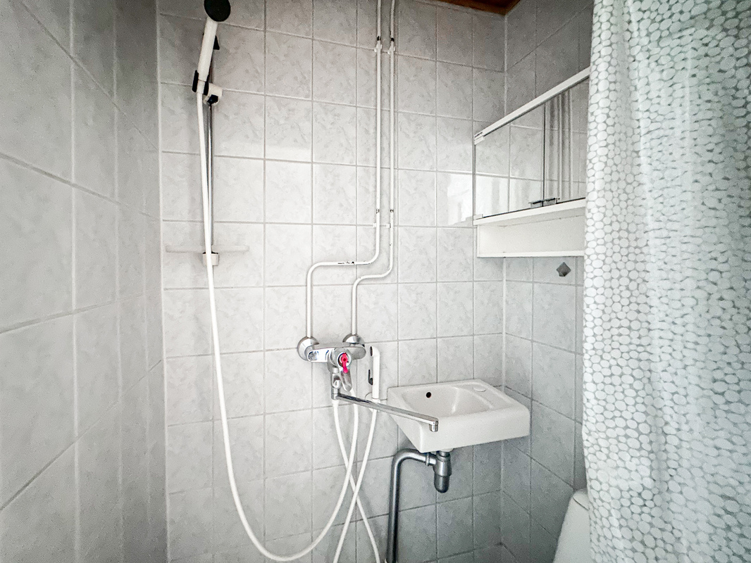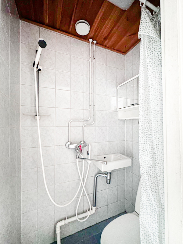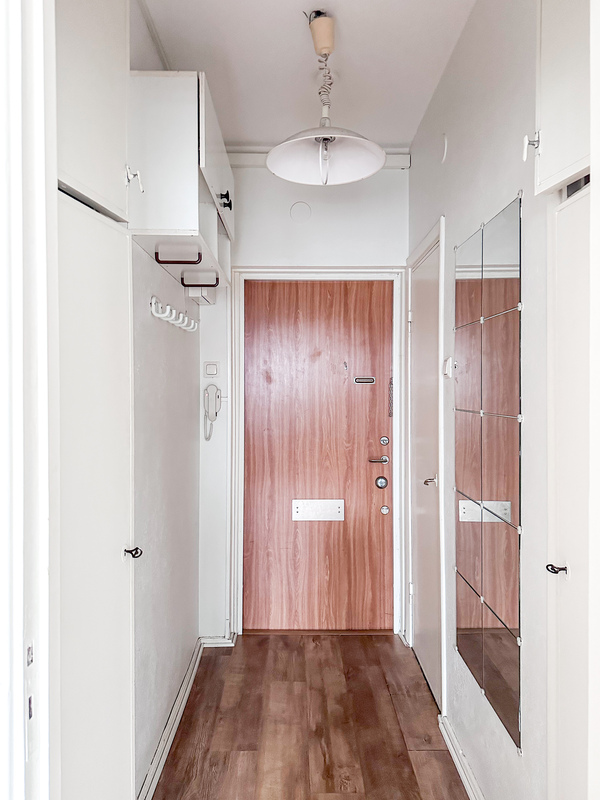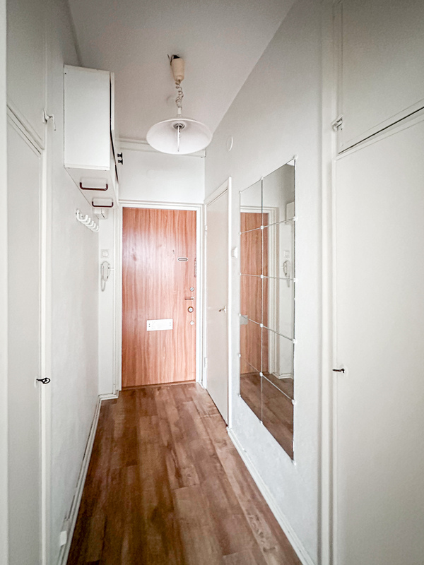 Kompakti kylpyhuone palvelee arjessa hyvin, ja pyykkihuolto onnistuu taloyhtiön pesutuvassa. Eteisessä on kaapistot käytännöllistä säilytystä varten.
