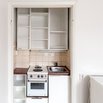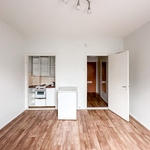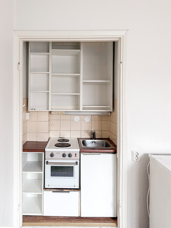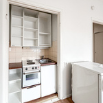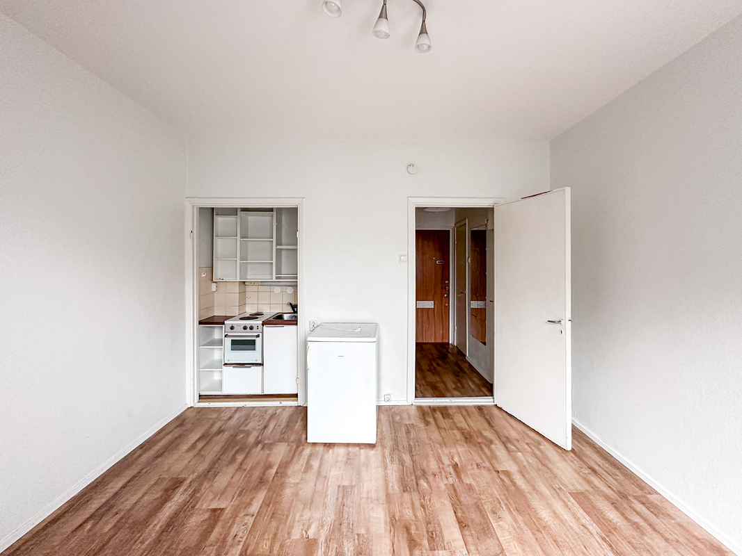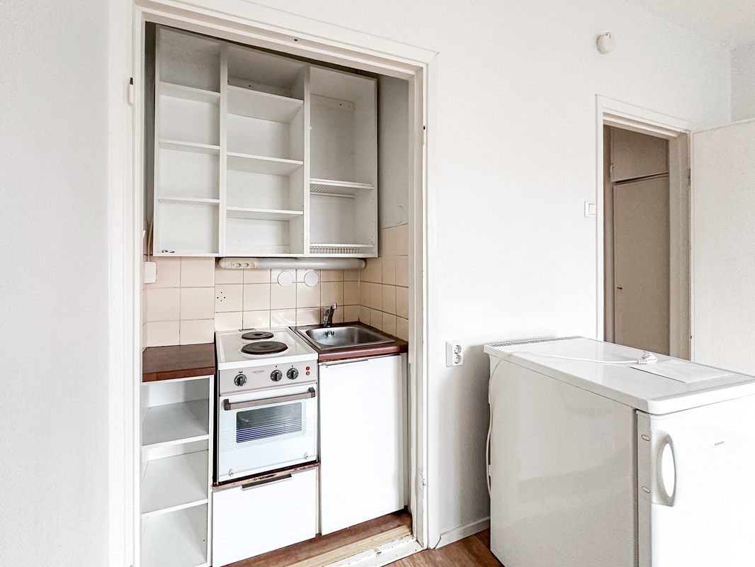 Hissitalon kolmannen kerroksen valoisa pikkukoti tarjoaa toimivan pohjaratkaisun ja helposti sisustettavan huoneen. Keittokomero on sijoitettu kätevästi yhdelle seinustalle, mikä tekee tilasta avaran ja monikäyttöisen.