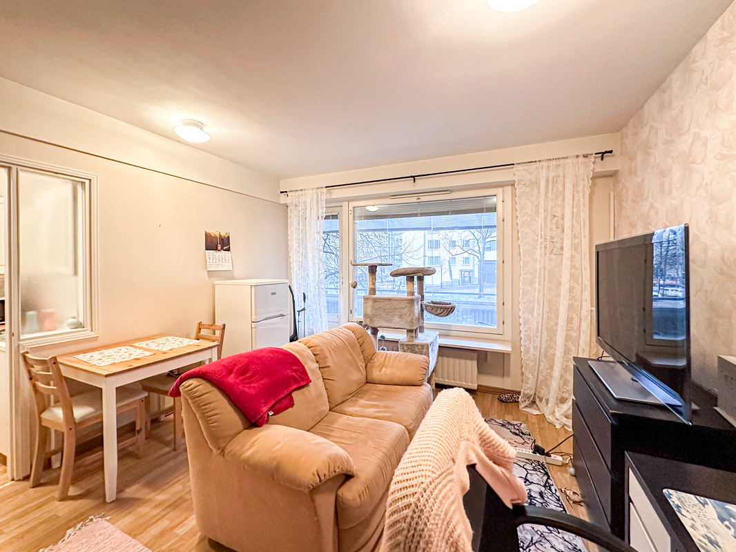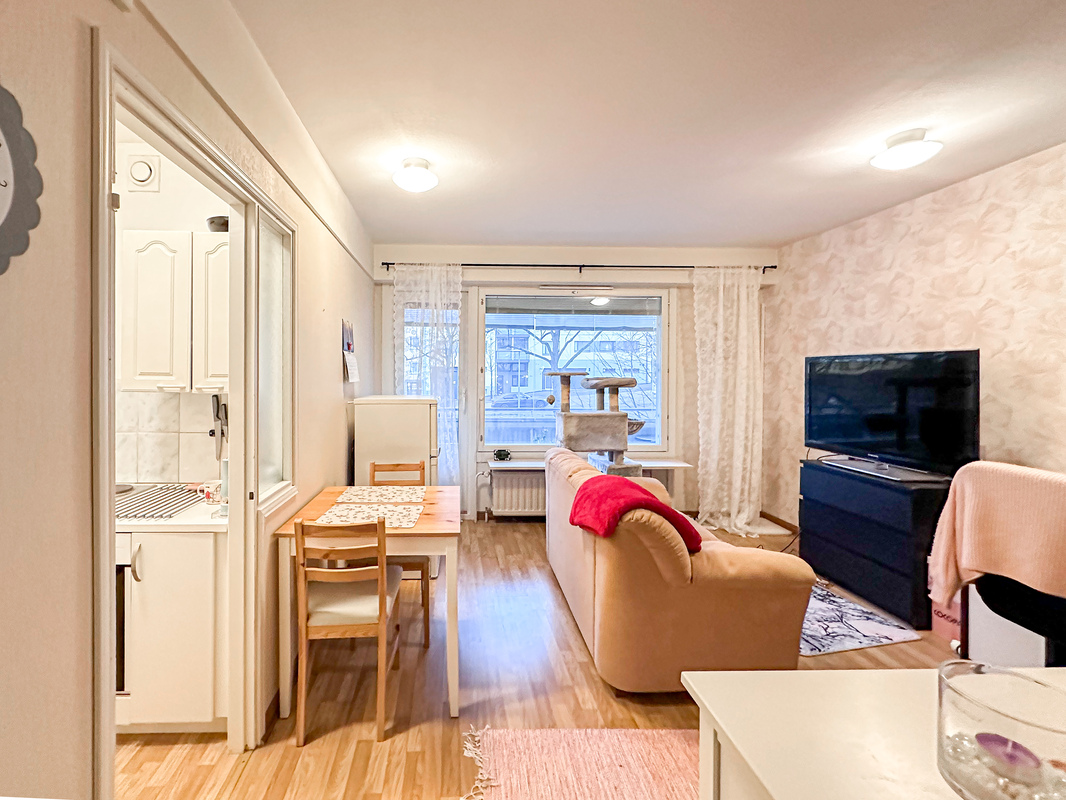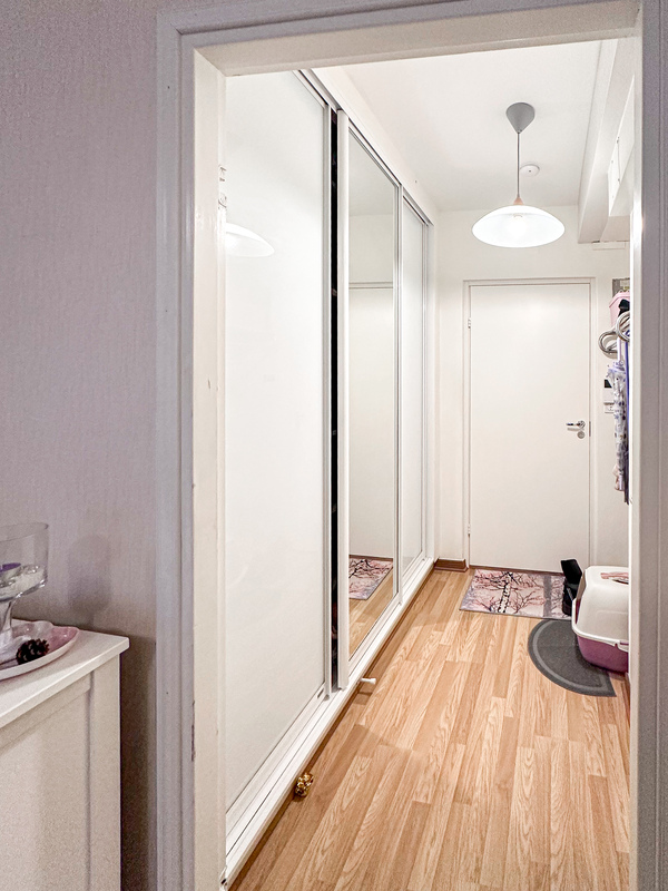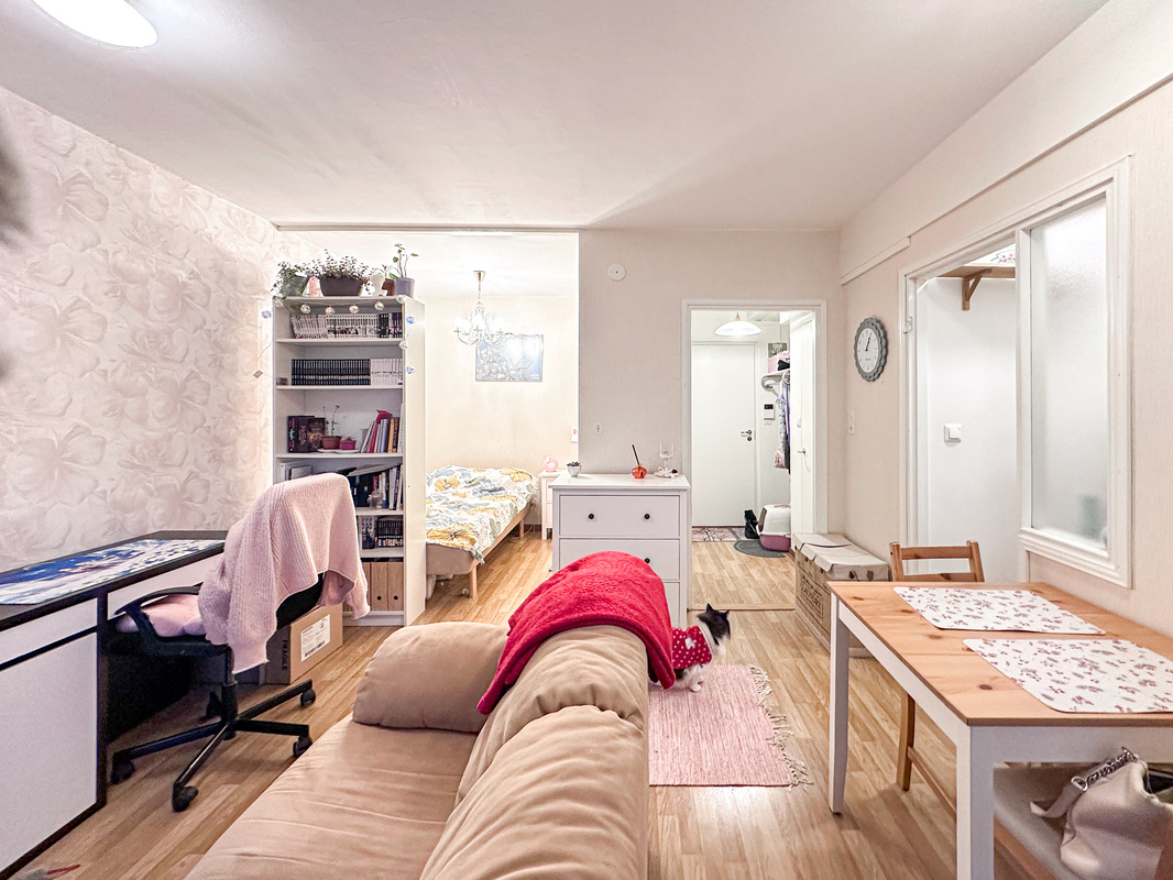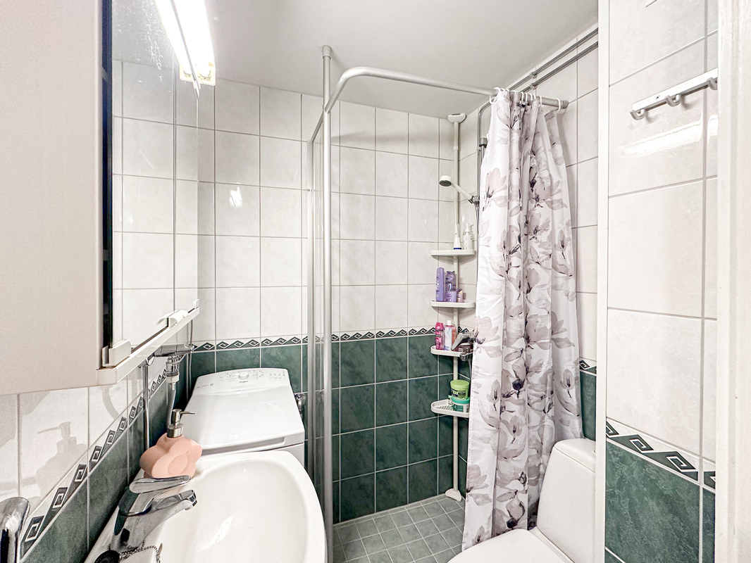 Tämä talon toisen kerroksen koti on valoisa ja viihtyisä. Keittiökomero on kompaktin kokoinen sisältäen kaiken tarvittavan ruoanlaittoon. Säilytystilaa löytyy eteisen liukuovikaapistoista runsaasti. Kylpyhuone on viihtyisä sekä nykypäiväinen ja siellä on liitäntä omalle pyykinpesukoneelle.