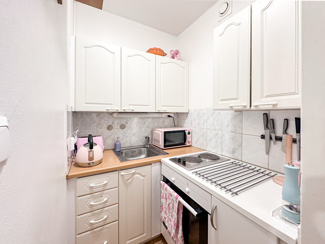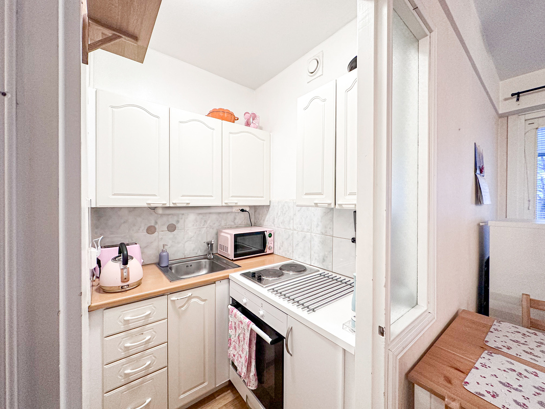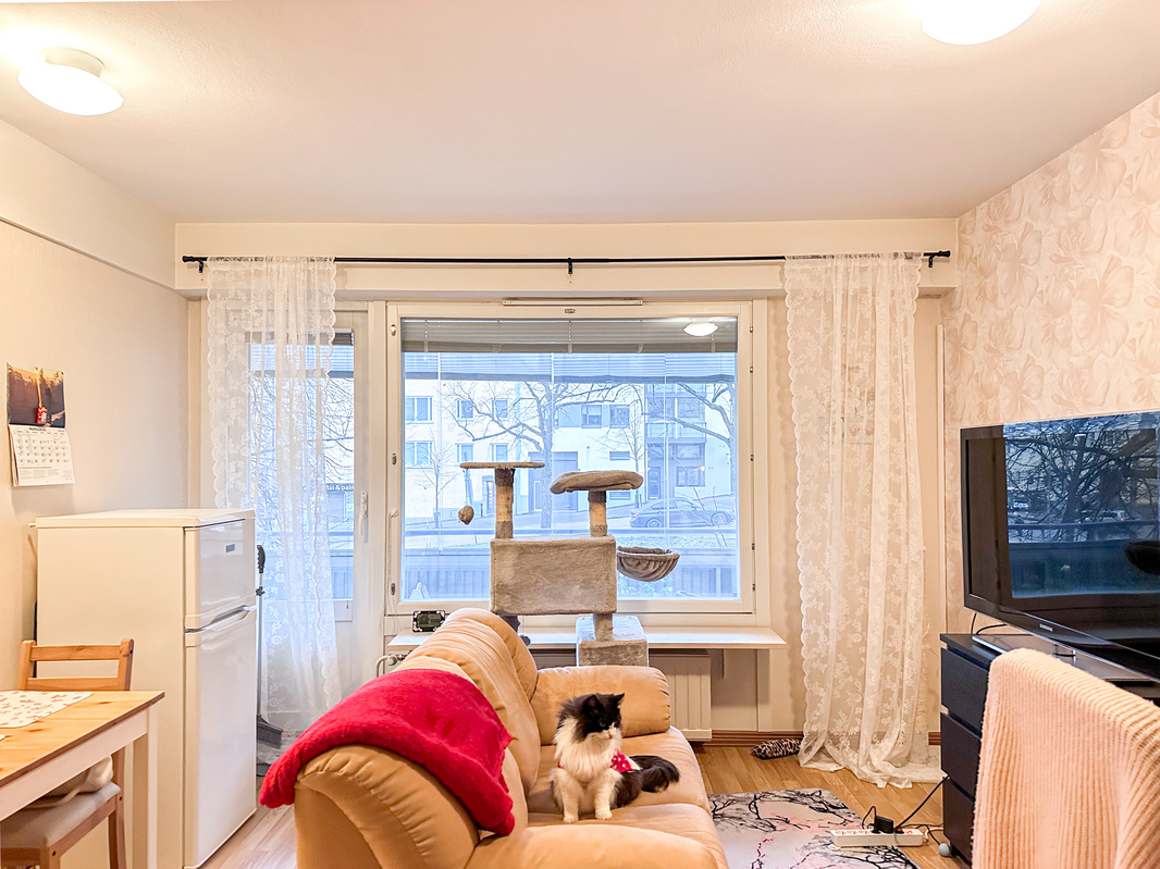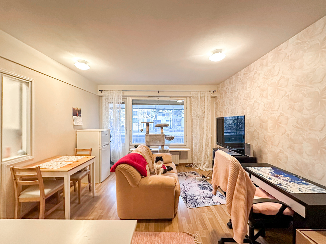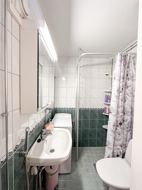 Tämä talon toisen kerroksen koti on valoisa ja viihtyisä. Keittiökomero on kompaktin kokoinen sisältäen kaiken tarvittavan ruoanlaittoon. Säilytystilaa löytyy eteisen liukuovikaapistoista runsaasti. Kylpyhuone on viihtyisä sekä nykypäiväinen ja siellä on liitäntä omalle pyykinpesukoneelle.