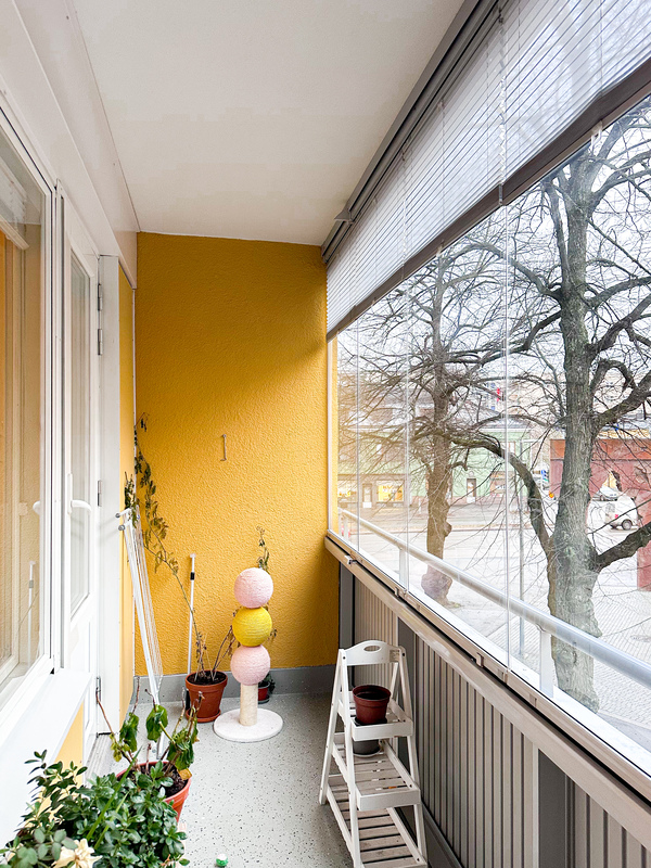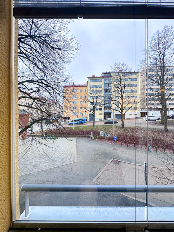 Lasitettu parveke Kirkkopuiston suuntaan avoimilla näkymillä kruunaa kokonaisuuden.