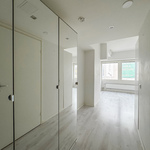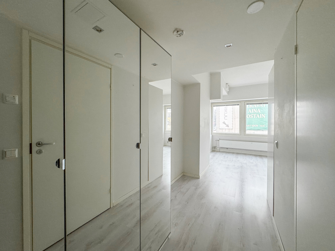 Tyylikäs peilikaappi tuo tilaan avaruutta ja valoa sekä tarjoaa aina tarpeellista säilytystilaa. Huoneisto on suunniteltu niin, että se tuntuu yhtä aikaa modernilta, viihtyisältä ja käytännölliseltä.