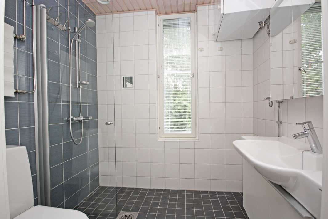 | Kylpyhuoneen kuvaus | Suihku, suihkuseinä, mukavuuslattialämmitys, wc-istuin, pidee-suihku ja peilikaappi. |