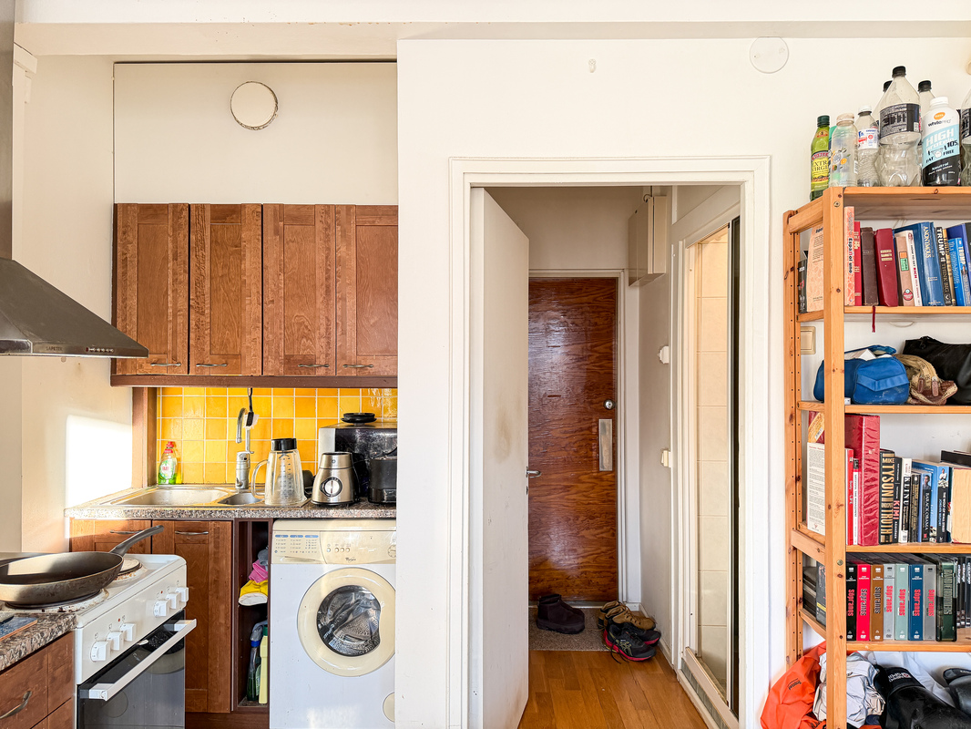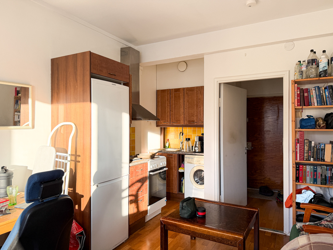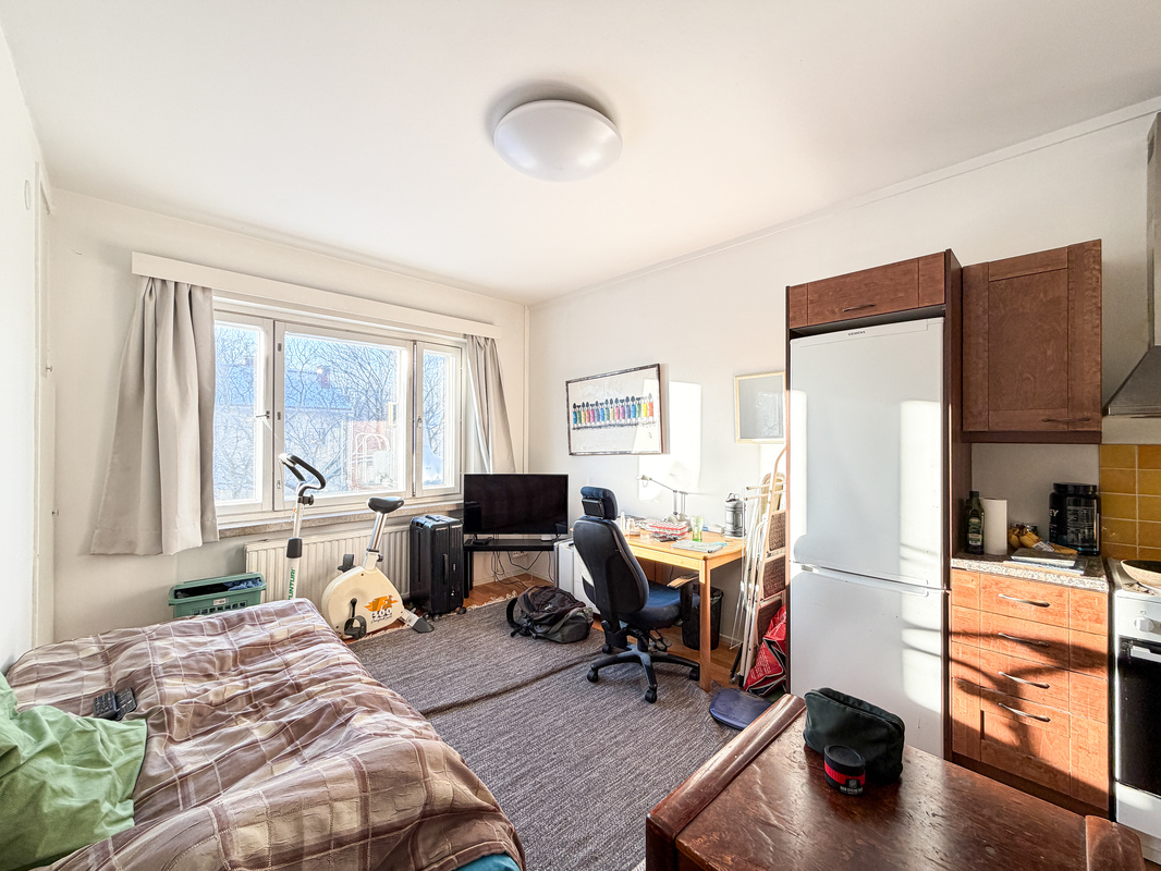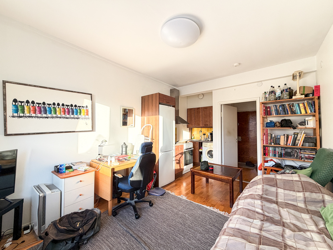Tässä kodissa on avoin pohjaratkaisu sillä keittiö yhdistyy mutkattomasti oleskelutilaan. Keittiöstä löytyy hyvin kaappitilaa ja huone on avara sekä valoisa. Erillisen eteisen erottelee väliovi ja eteisen puolelta on kulku kompaktiin kylpyhuoneeseen. Keittiöön saa haluttaessa asennettua pyykinpesukoneen tai pesu onnistuu myös taloyhtiön pesutuvassa.