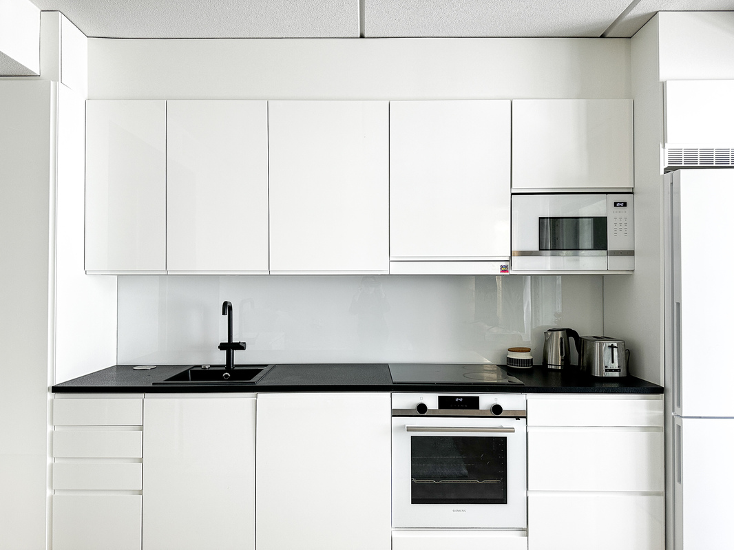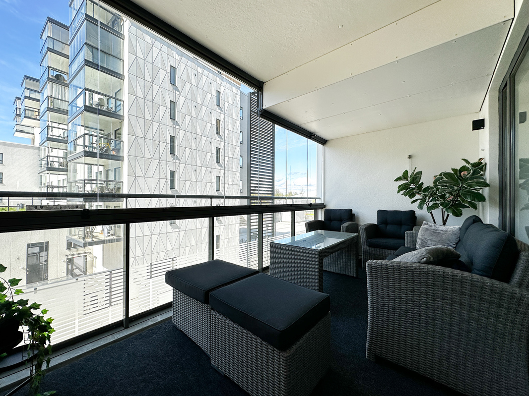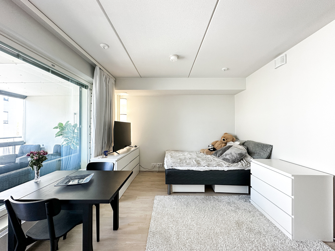 Huone on varusteltu sängyllä, keittiönpöydällä tuoleineen sekä valkoisella lipastolla. Huoneesta on kulku valtavalle lasitetulle parvekkelle, josta löytyy parvekekalusteet.
