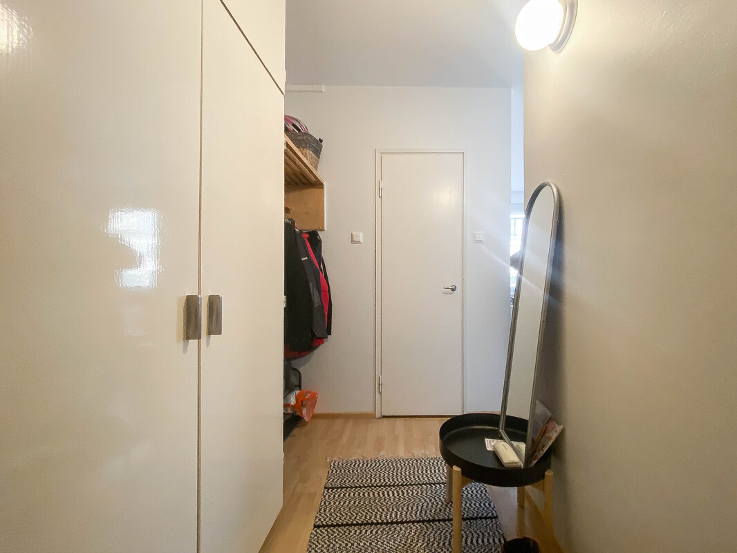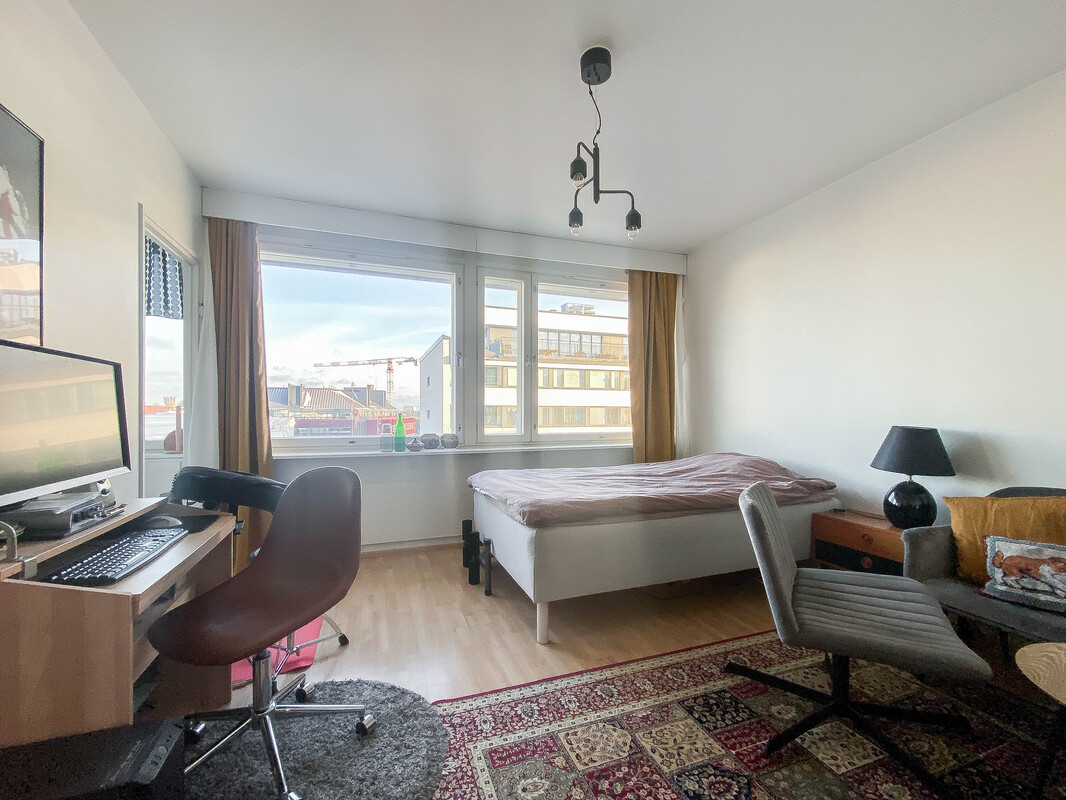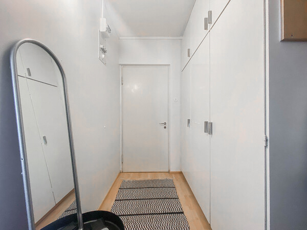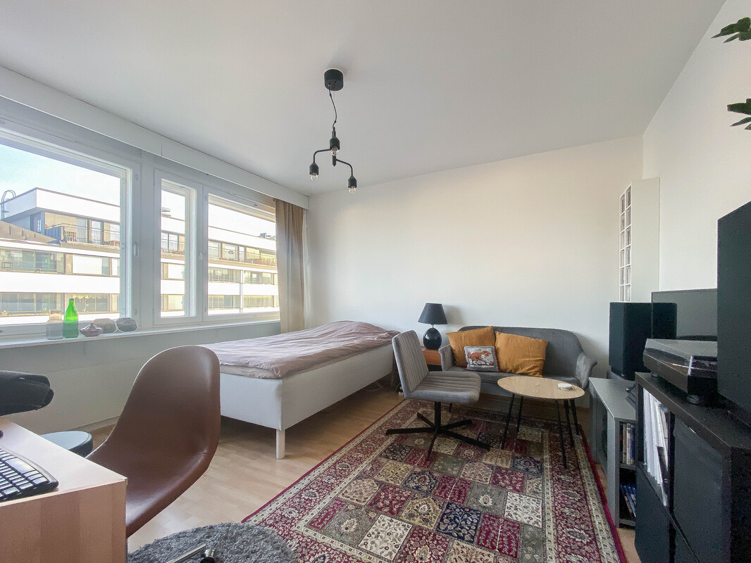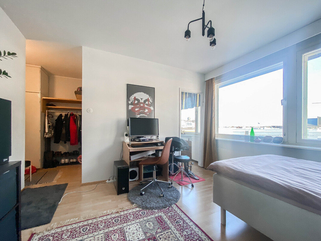 Tämä koti pitää sisällään erittäin toimivan pohjaratkaisun. Avara huone tarjoaa mahdollisuuksia sisustusratkaisuille ja siellä on hyvin tilaa niin sängylle kuin oleskeluun ja vaikka työpisteelle omien tarpeiden mukaan. Suurista ikkunoista tulvii valoa asuntoon ja ikkunoista avautuu näkymät pitkälle. Huoneen yhteydessä on ikkunallinen keittokomero. Eteisestä löytyy kaapistoja säilytystilaa varten. Tilava, laatoitettu kylpyhuone on varustettu pyykinpesukoneliitännällä. Vaaleat pintamateriaalit antavat oivan pohjan sisustukselle!