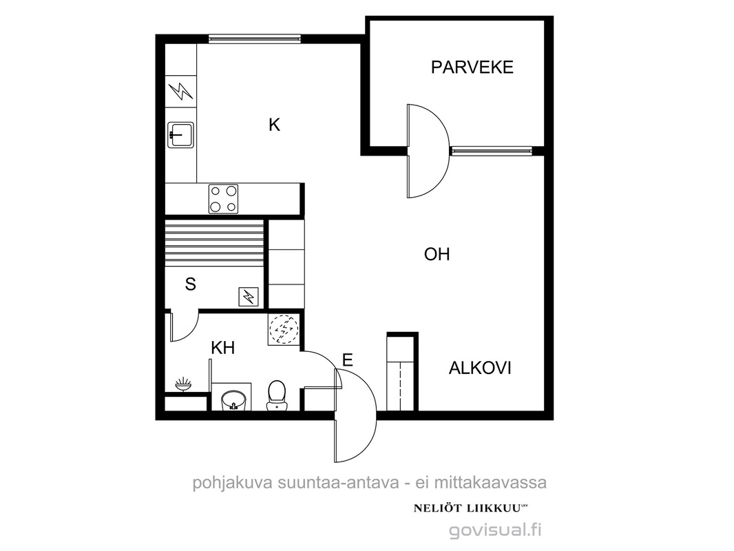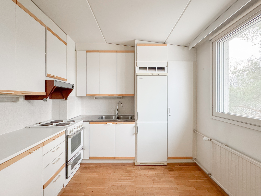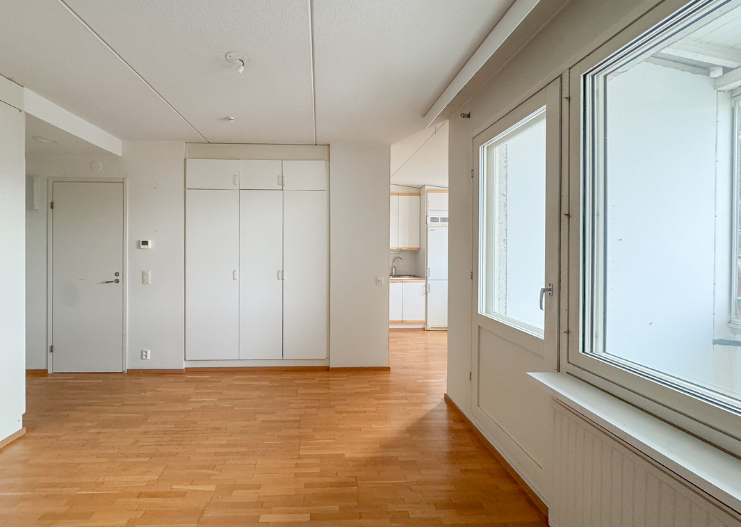 Huoneistossa on käytännöllinen alkovi, joka erottaa nukkumatilan oleskelutilasta. Keittiö on peruskuntoinen ja siisti sekä tarjoaa mukavasti kaappitilaa.