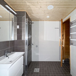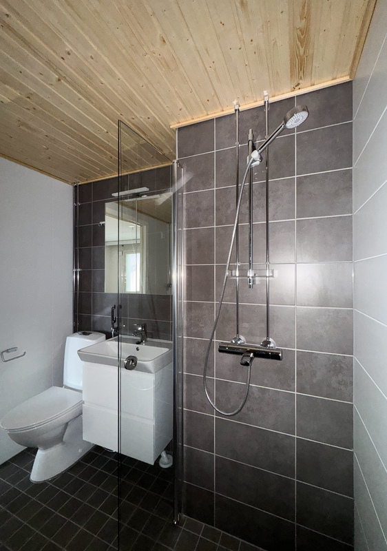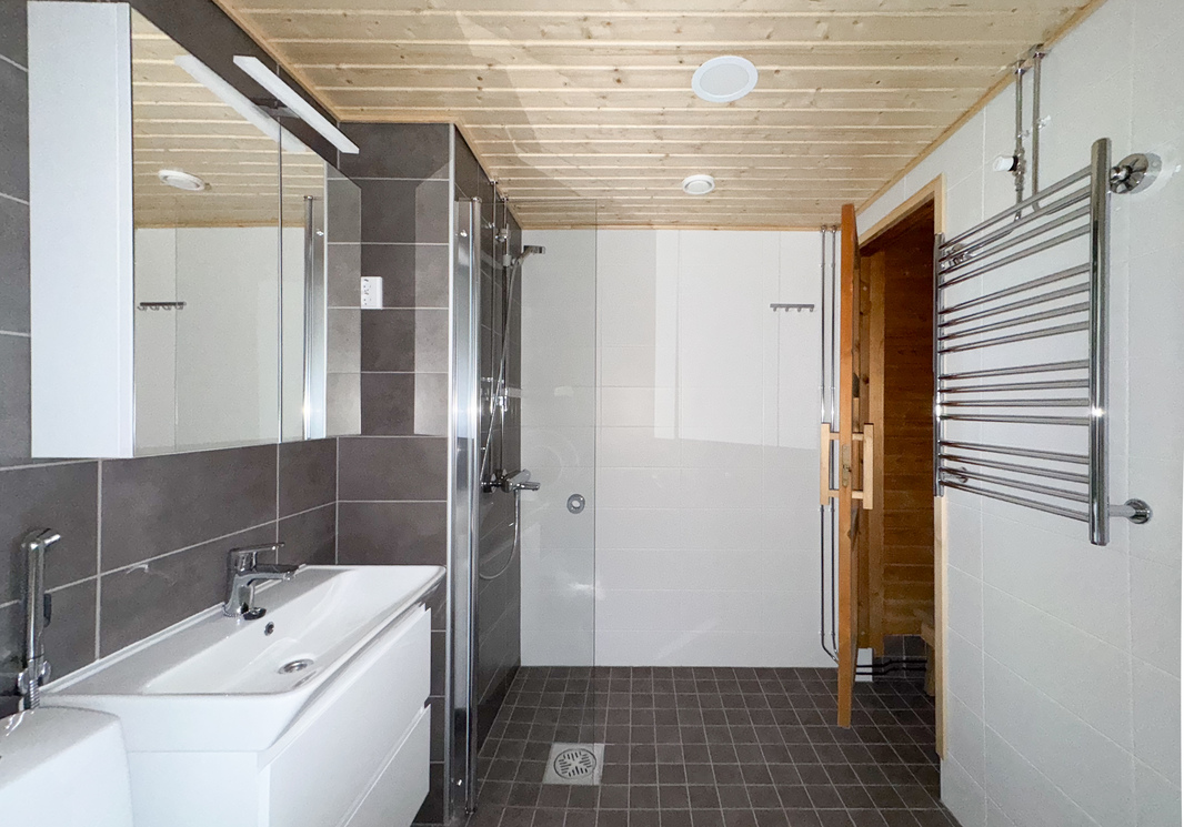 Kylpyhuone on remontoitu, ja tuo arkeen lisää viihtyisyyttä. Liitäntä pyykinpesukoneelle löytyy.