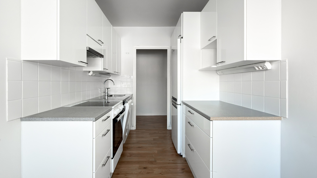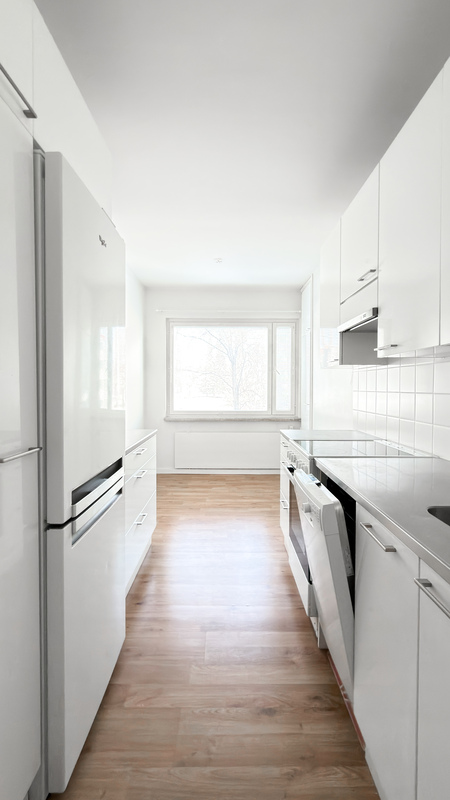 Asunnossa on erillinen keittiö, joka on varustettu moderneilla kodinkoneilla ja jossa on tilaa ruokapöydälle. Tämä tekee keittiöstä täydellisen paikan niin arjen kokkailuun kuin ystävien kanssa vietettyihin illanviettoihin. Kylpyhuone on moderni ja tyylikäs, tarjoten mukavuutta arjen keskelle.