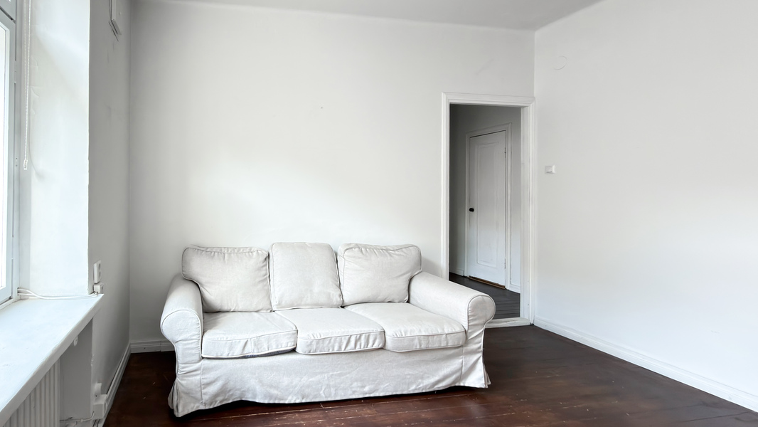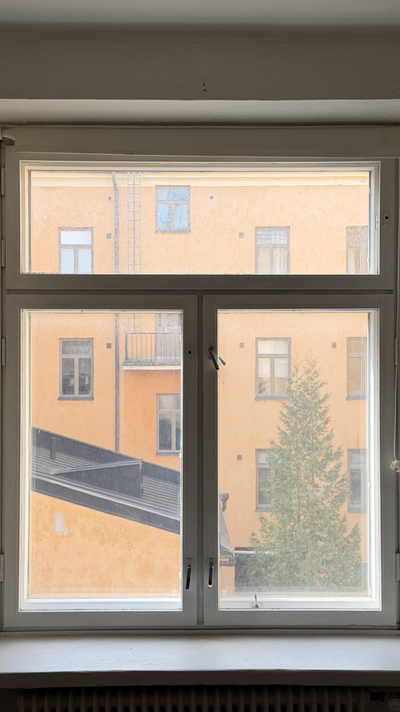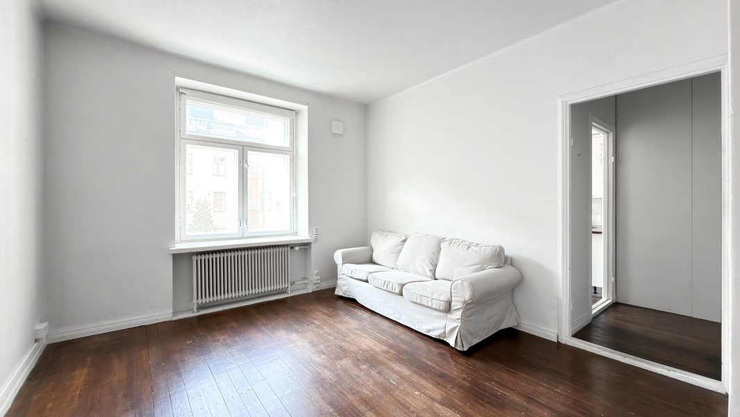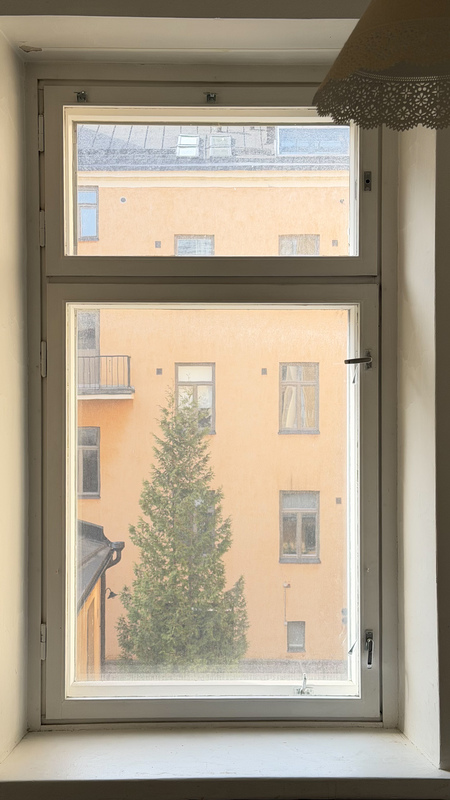 Asunnon huone on tilava ja helposti sisustettava, ja korkea huonekorkeus tuo tilaan avaruutta ja arvokkuutta. Ikkunoista avautuvat rauhalliset näkymät sisäpihalle, mikä tekee asumisesta miellyttävän hiljaista keskellä kaupunkia. Eteisessä on lisäksi runsaat kiinteät kaapistot, jotka tarjoavat hyvin säilytystilaa.