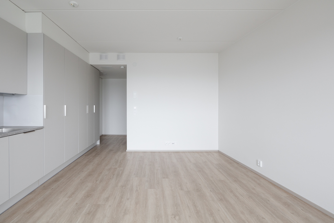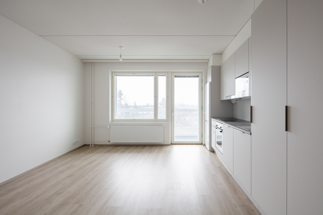 Asunnossa yhdistyvät modernit pinnat, erinomainen pohjaratkaisu sekä tehokas tilankäyttö. Avokeittiö ja tilava asuinhuone muodostavat yhtenäisen ja viihtyisän kokonaisuuden. Keittiö on varusteltu nykyaikaisilla kodinkoneilla ja tarjoaa runsaasti kaappi- ja laskutilaa. Keittiön yhteydessä on lisäksi käytännöllistä säilytystilaa vaatteille ja muille tarvikkeille.