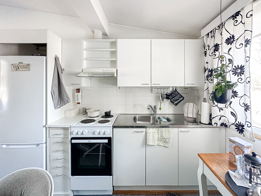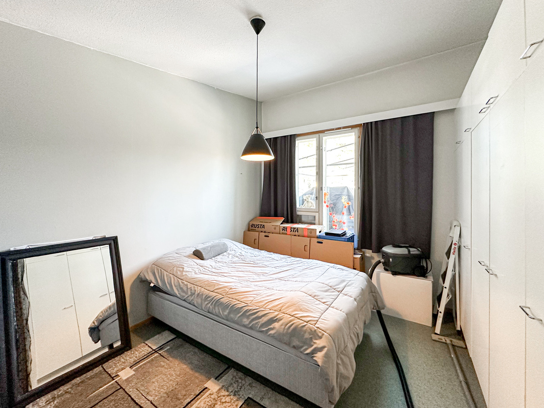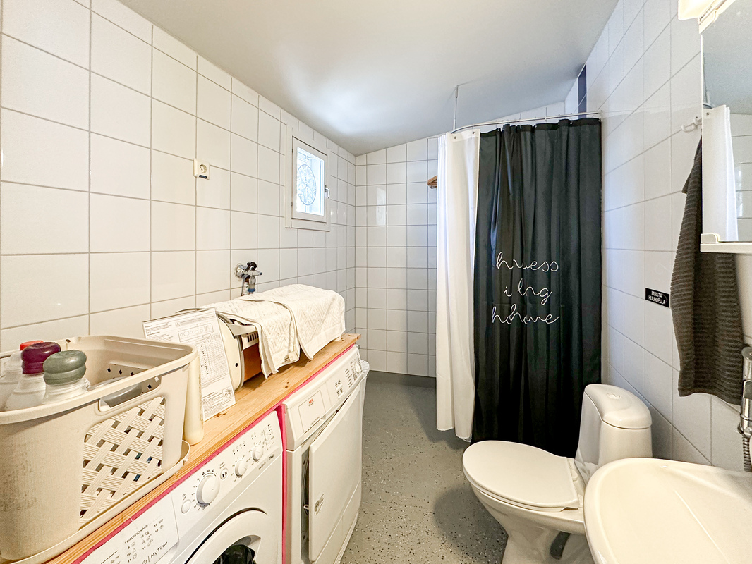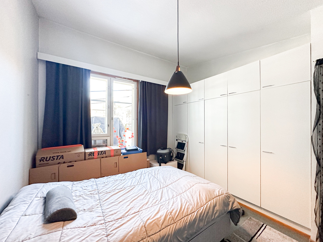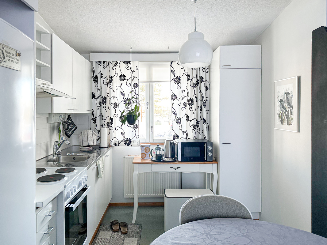 Keittiö on käytännöllinen ja tarjoaa hyvin kaappi- ja laskutilaa. Makuuhuoneessa on rauhallinen tunnelma ja tilaa isommallekin sängylle ja koko seinällinen kaapistoja ratkaisee säilytysongelmat. Kylpyhuone on siisti ja toimiva kokonaisuus ja siellä on luonnollisesti tilaa omalle pyykinpesukoneelle.
