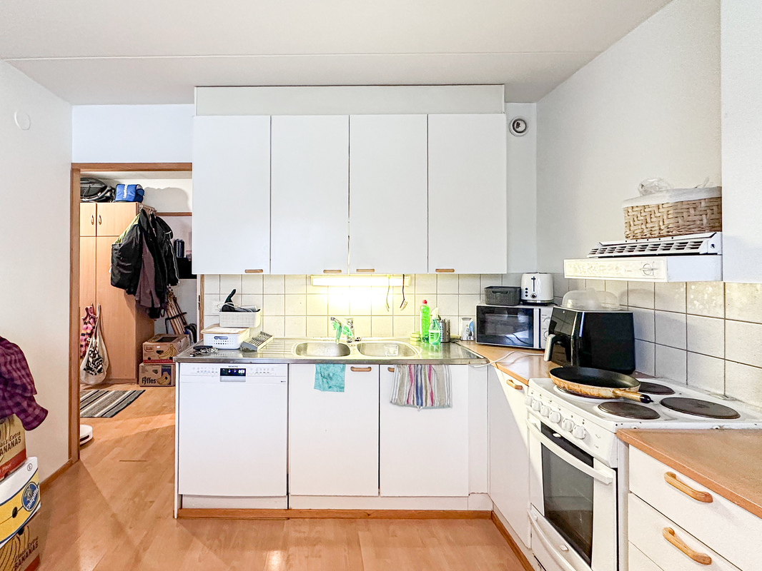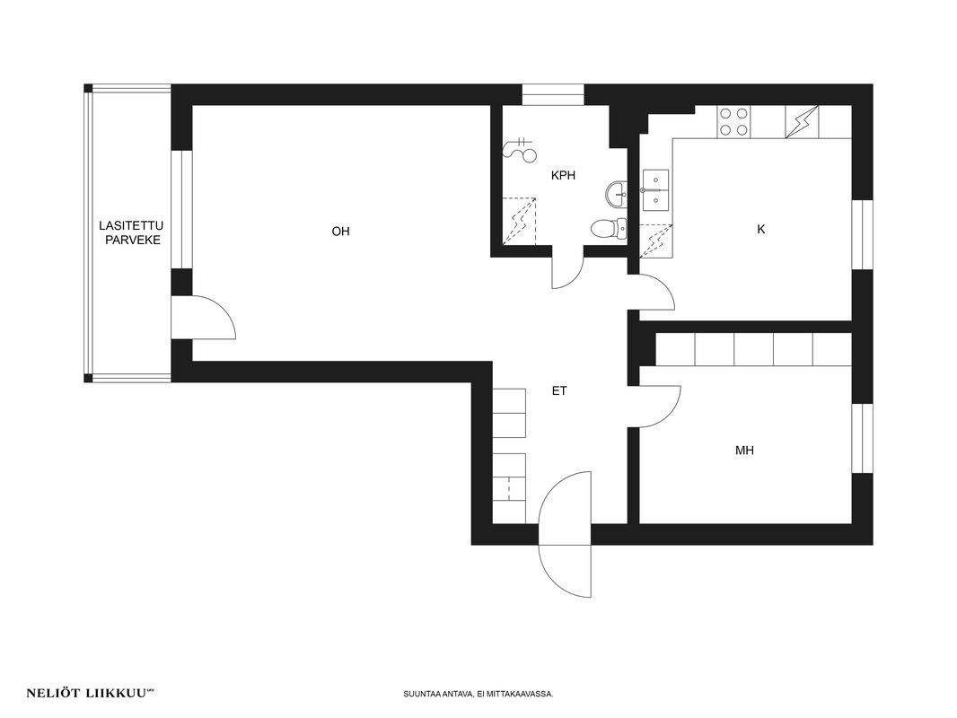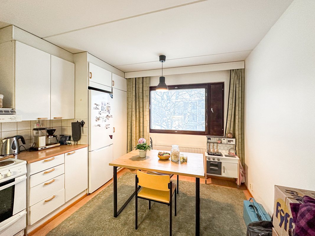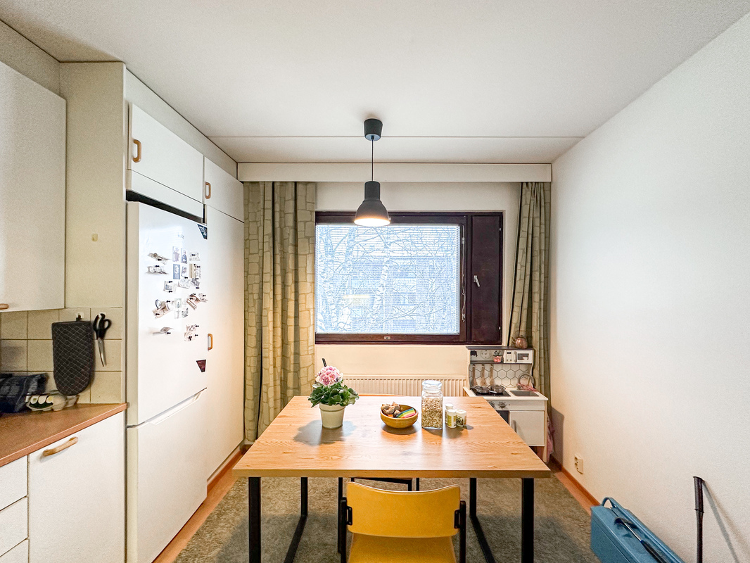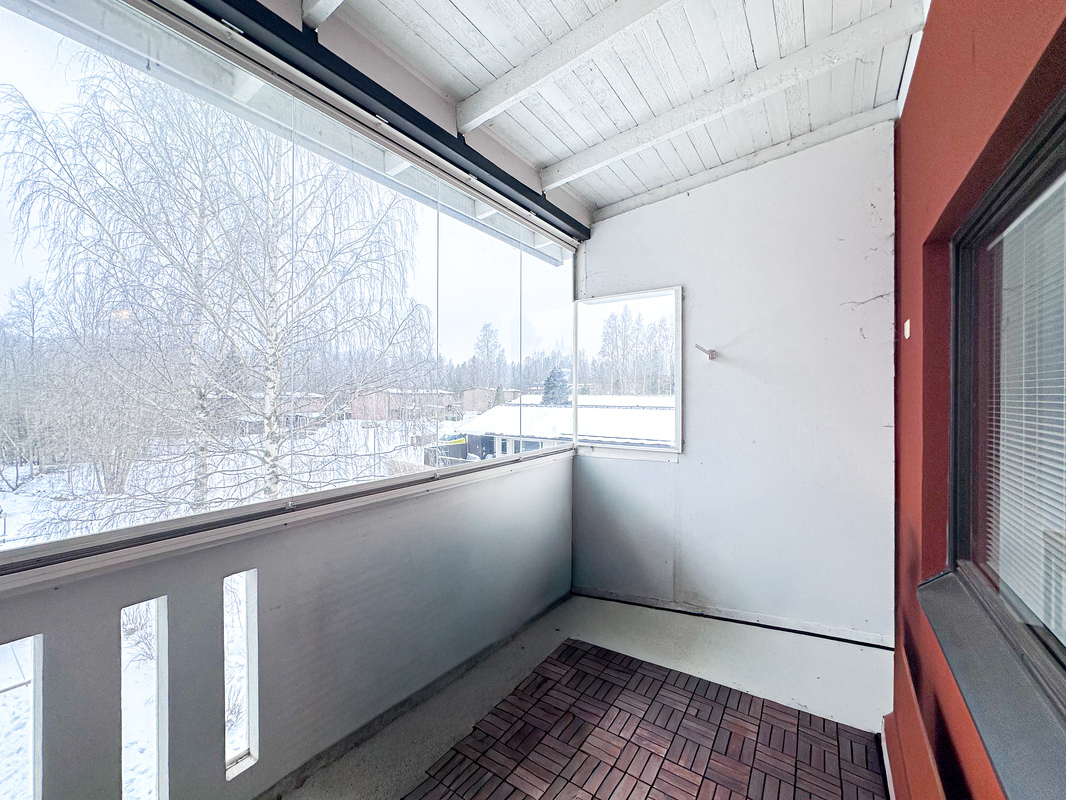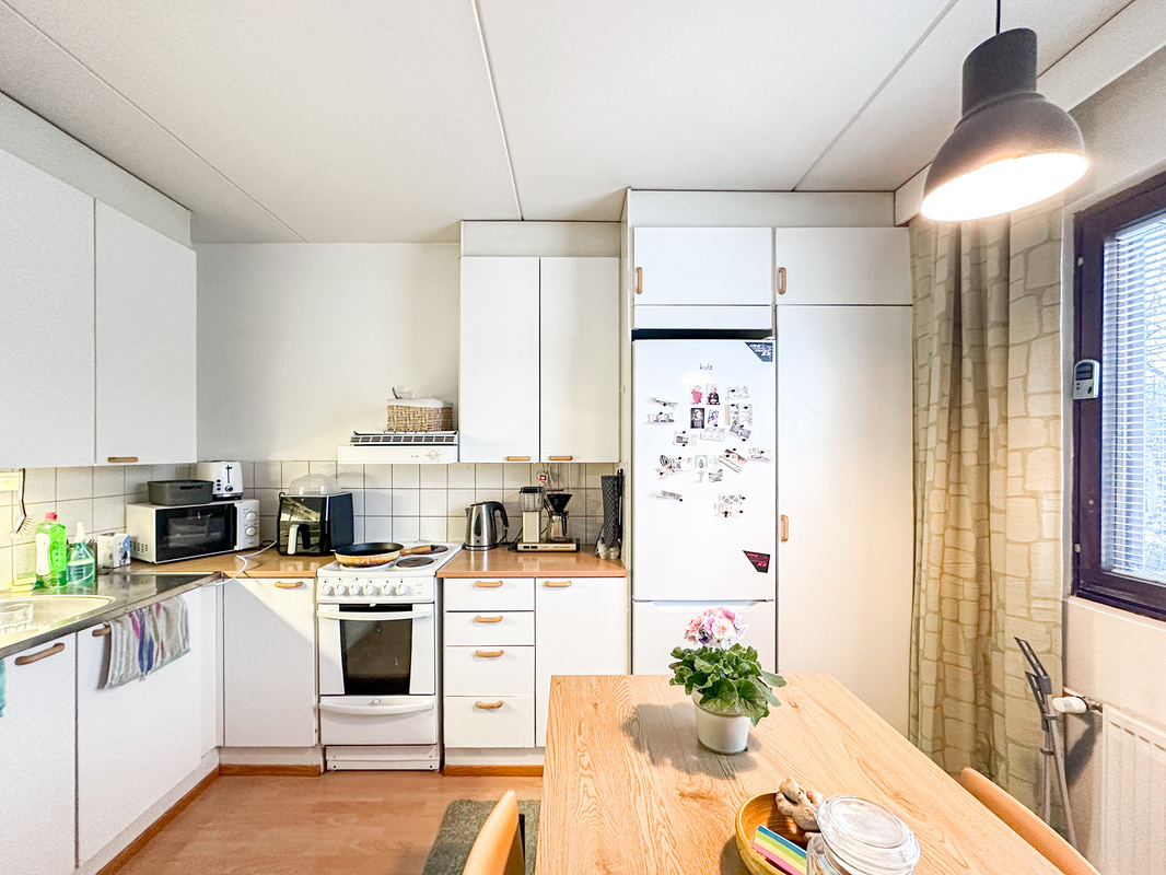 Valoisa olohuone toimii kodin sydämenä ja jatkuu lasitetulle parvekkeelle, joka tuo mukavasti lisätilaa asumiseen aikaisesta keväästä pitkälle syksyyn. Läpitalon ratkaisu tuo asuntoon runsaasti luonnonvaloa ja luo avaran sekä rauhallisen tunnelman läpi koko huoneiston. Keittiössä on tilaa ruokapöydälle ja tilavaan kylpyhuoneeseen saa pyykinpesukoneen tai vaikka pesutornin mahtumaan.
