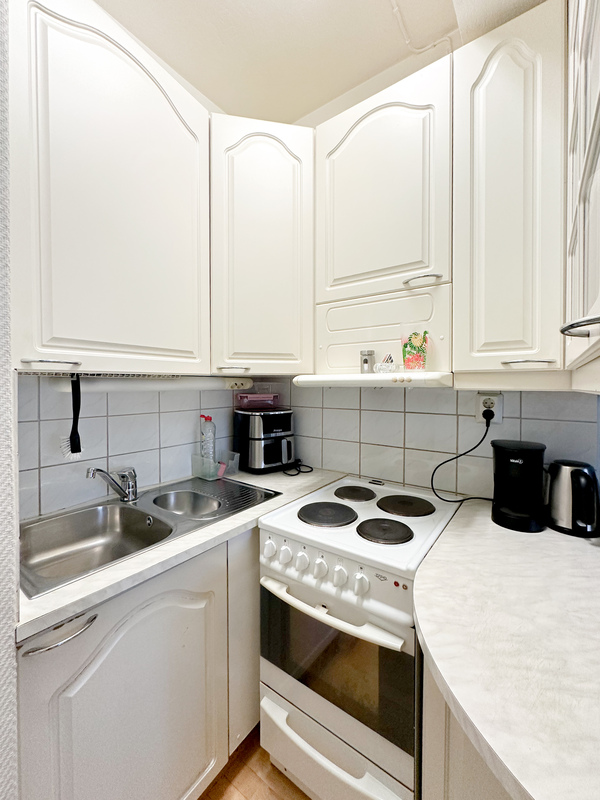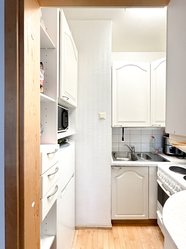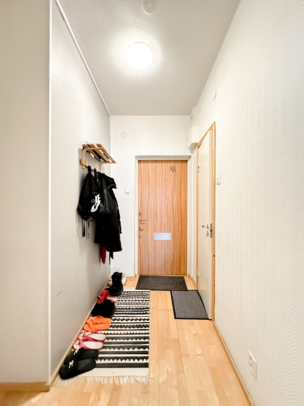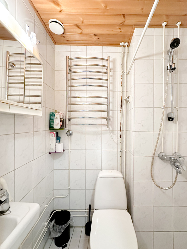 Makuuhuoneessa on runsaasti kaappitilaa, ja lisäksi asunnosta löytyy erillinen vaatehuone, joka helpottaa säilytystä entisestään. Kylpyhuone on kompakti ja toimiva kokonaisuus.