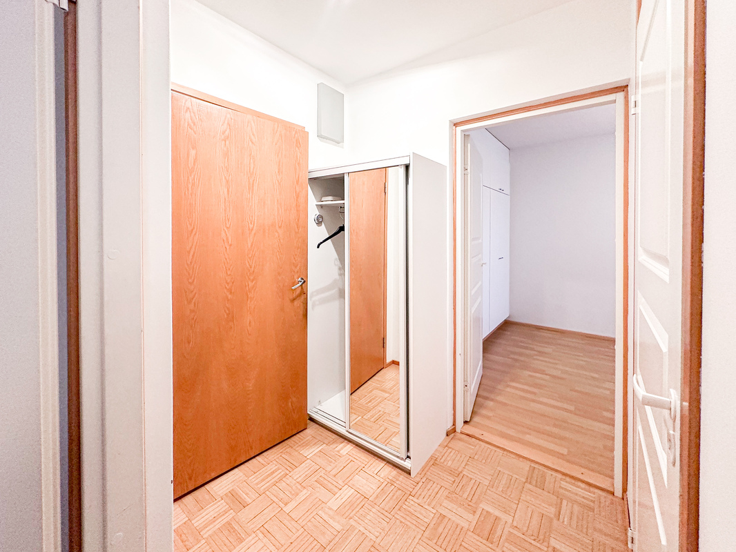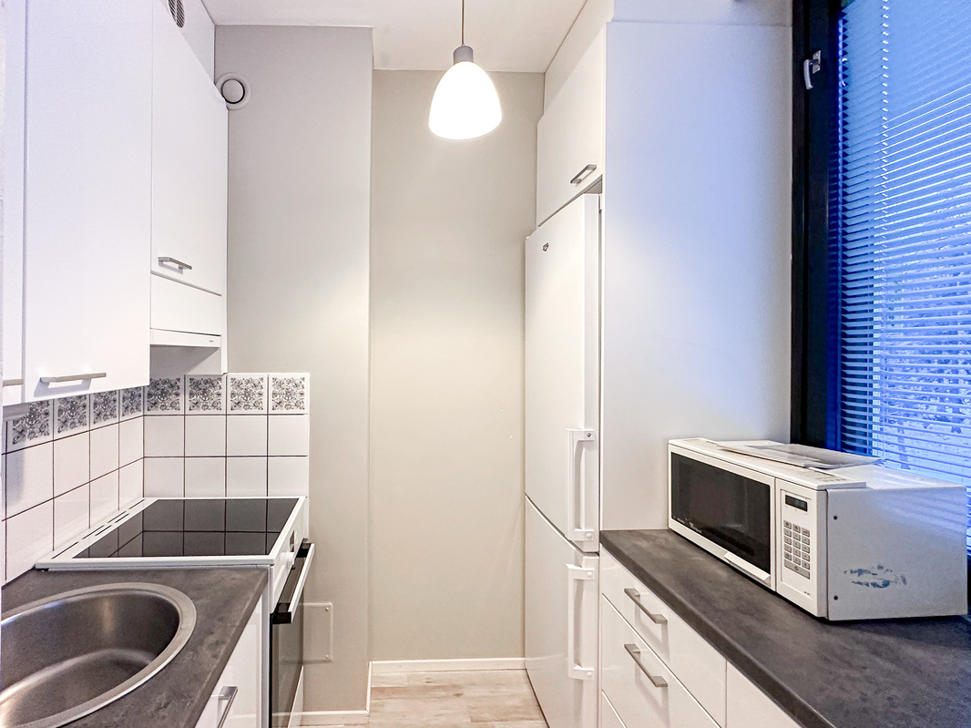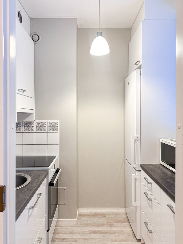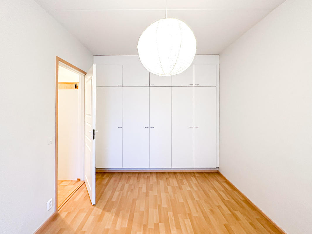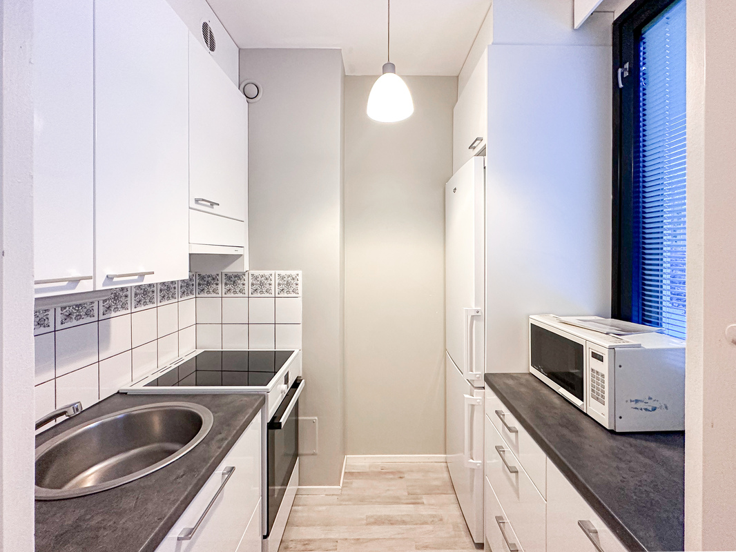 Tässä hissitalon toisen kerroksen kodissa on tehokas ja toimiva pohjaratkaisu. Eteisestä käynti kylpyhuoneeseen, jossa on luonnollisesti paikka omalle pyykinpesukoneelle. Keittokomero on kompakti, mutta siellä on kaikki tarvittava ruoanlaittoa varten. Makuuhuoneessa on tilaa parisängylle sekä kaapistot säilytykseen ja käynti lasitetulle parvekkeelle.