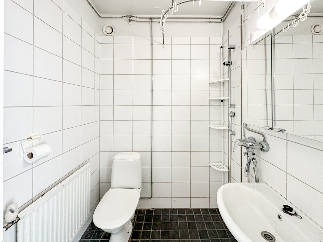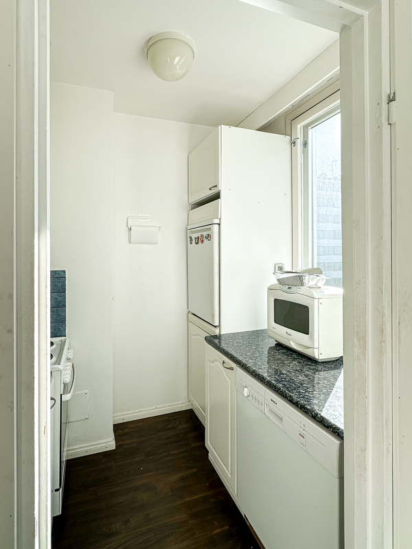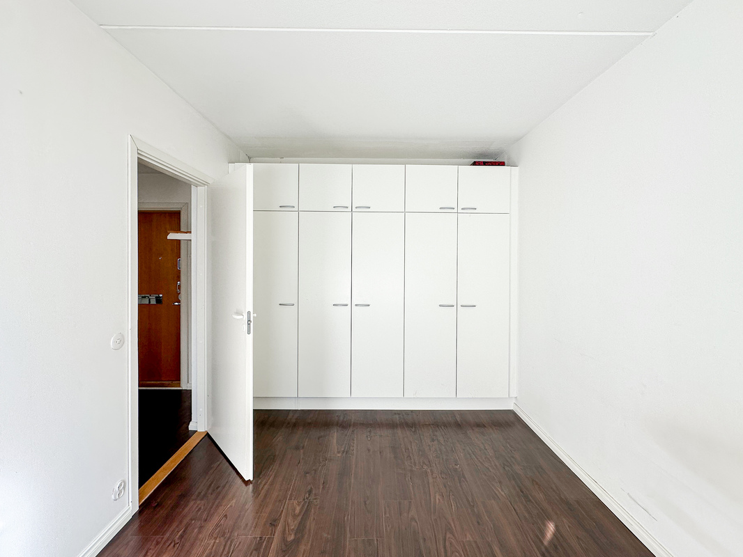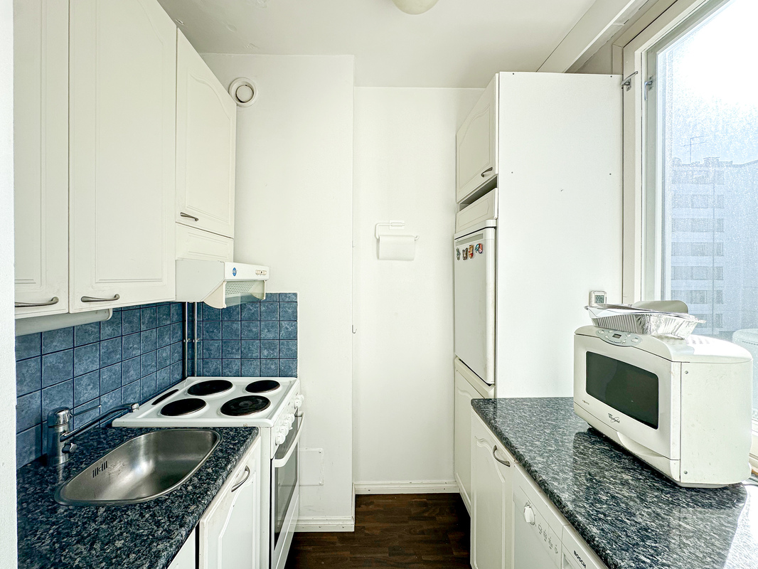 Tässä talon neljännen kerroksen kodissa on tehokas ja toimiva pohjaratkaisu. Eteisestä käynti kylpyhuoneeseen, jossa on luonnollisesti paikka omalle pyykinpesukoneelle. Keittokomero on kompakti ja siellä on kaikki tarvittava ruoanlaittoa varten. Makuuhuoneessa on tilaa parisängylle sekä kaapistot säilytykseen ja käynti lasitetulle parvekkeelle.