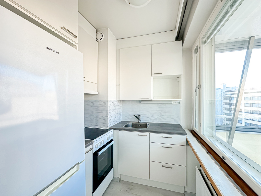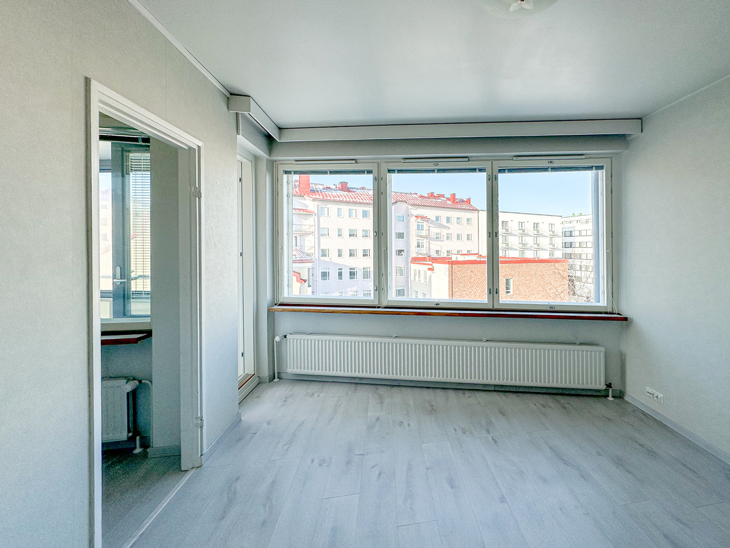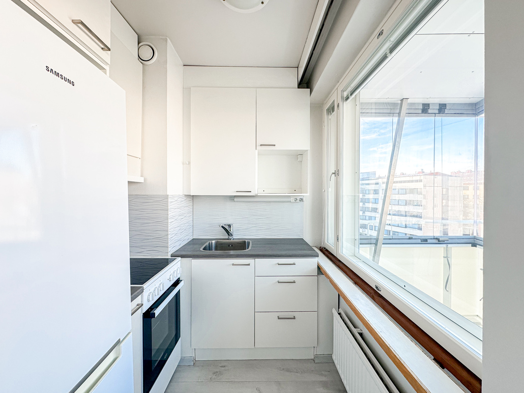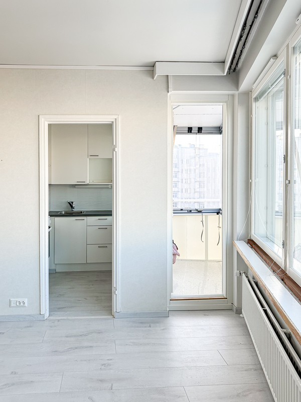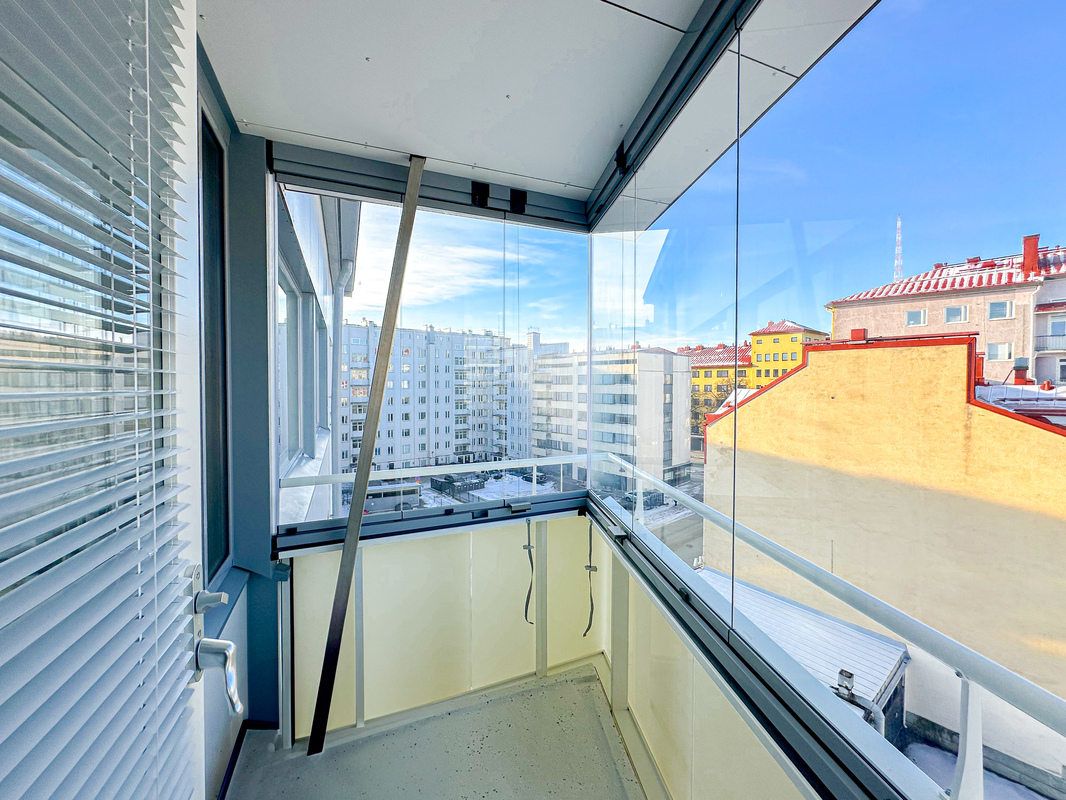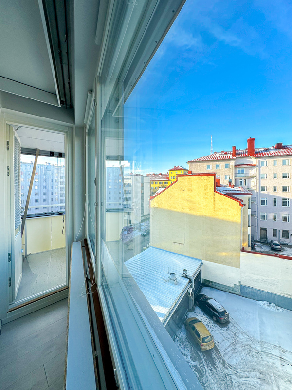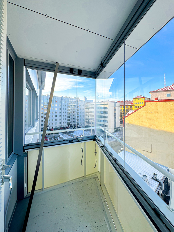 Kodissa on siistit ja hyvin pidetyt pinnat, ja sen tilat on käytetty tehokkaasti. Kylpyhuoneessa on pesukoneliitäntä, joka lisää arjen käytännöllisyyttä. Ikkunat avautuvat rauhalliselle sisäpihalle, tuoden kotiin yksityisyyttä ja rauhaa keskellä kaupunkia. Kodin parvekkeelta avautuu miellyttävä kaupunki näkymä.