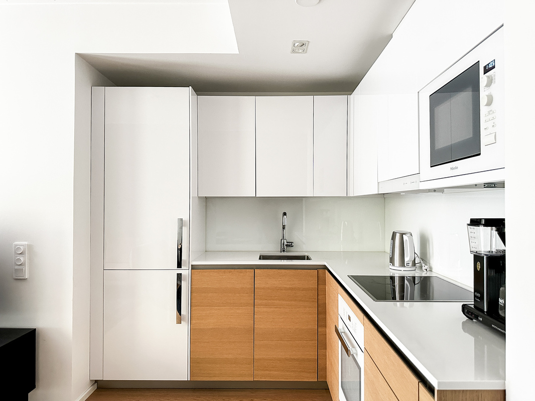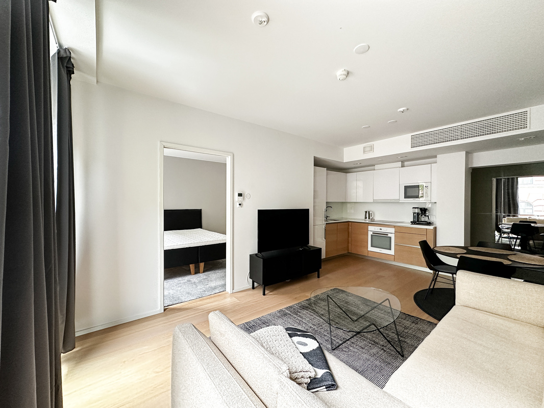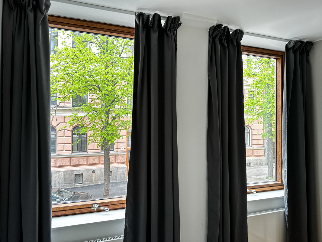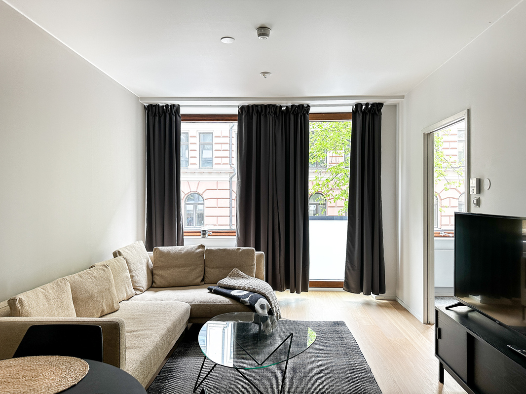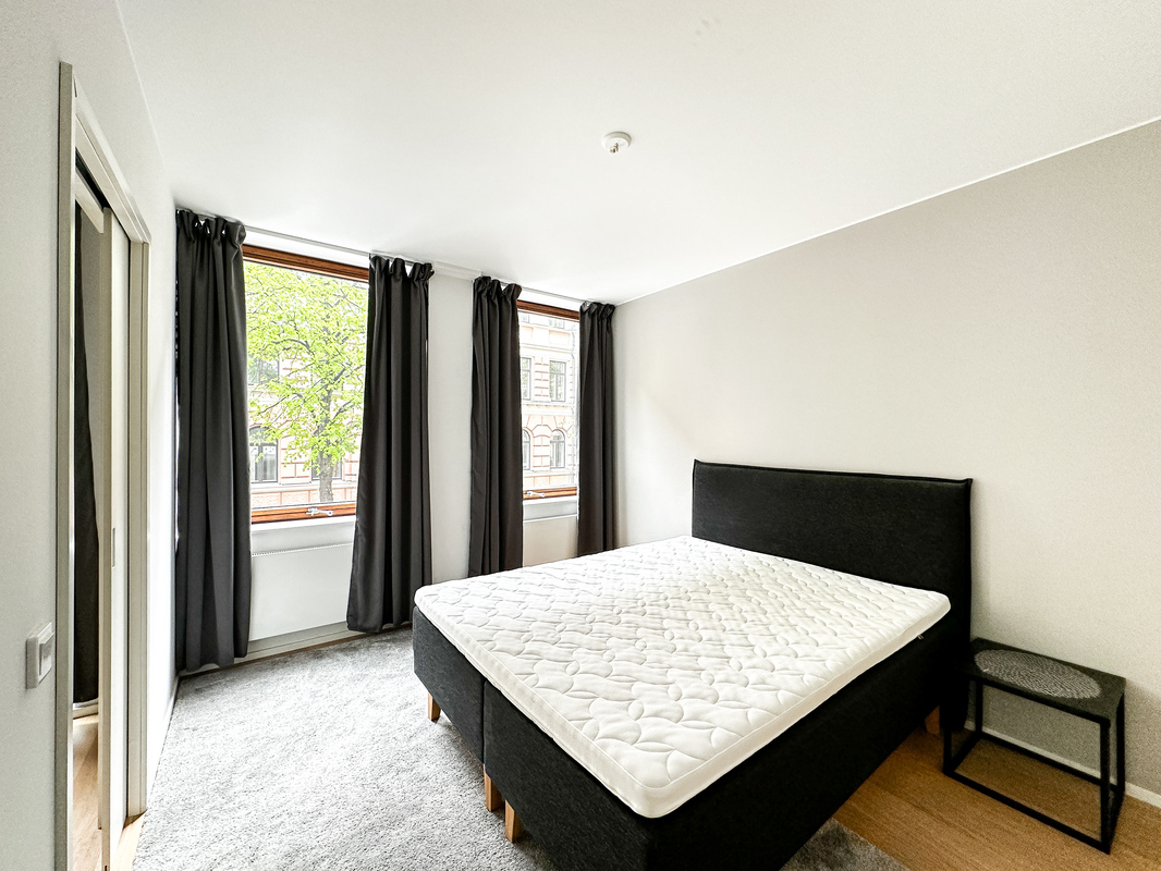 This beautiful home feels more spacious than its square footage and is wonderfully spacious. The open kitchen connects seamlessly to the living room and all the necessary equipment is available, including crockery and cooking utensils. The bedroom is wonderfully bright thanks to two large windows and the views from both rooms are towards Unioninkatu. The bedroom has a huge walk-in closet and there is also direct access to the bathroom from here. The bathroom is stylish and there is a washing machine for the resident's use. More storage space can be found in the mirror cabinet in the hallway.