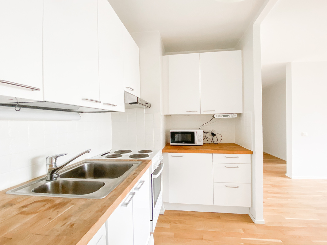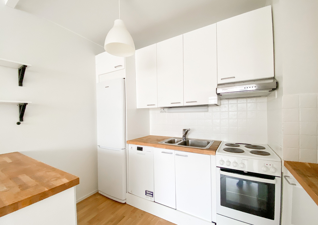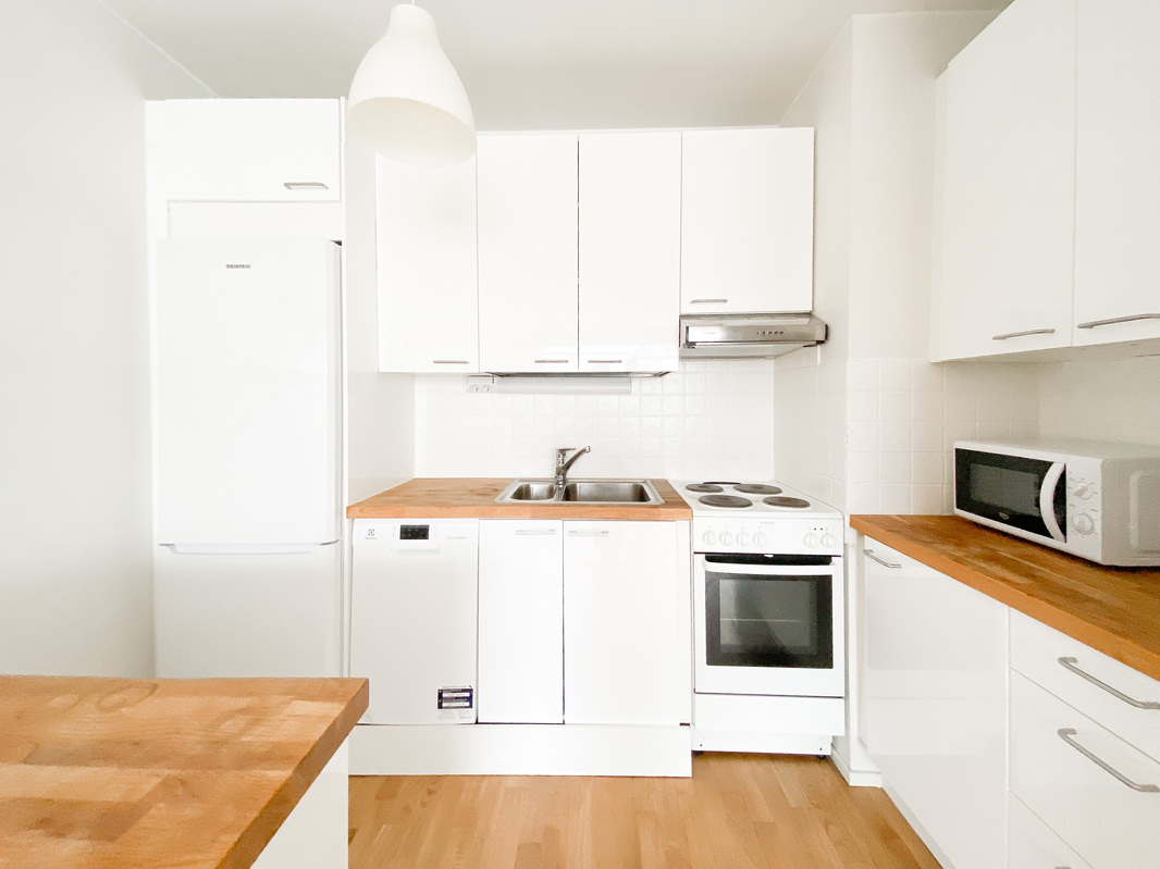 Tyylikäs ja ajaton keittiö laadukkaalla laadukkaalla puutasolla on remontoitu muutama vuosi sitten tarjoten erinomaiset puitteet kokkailuun astianpesukonetta myöden.