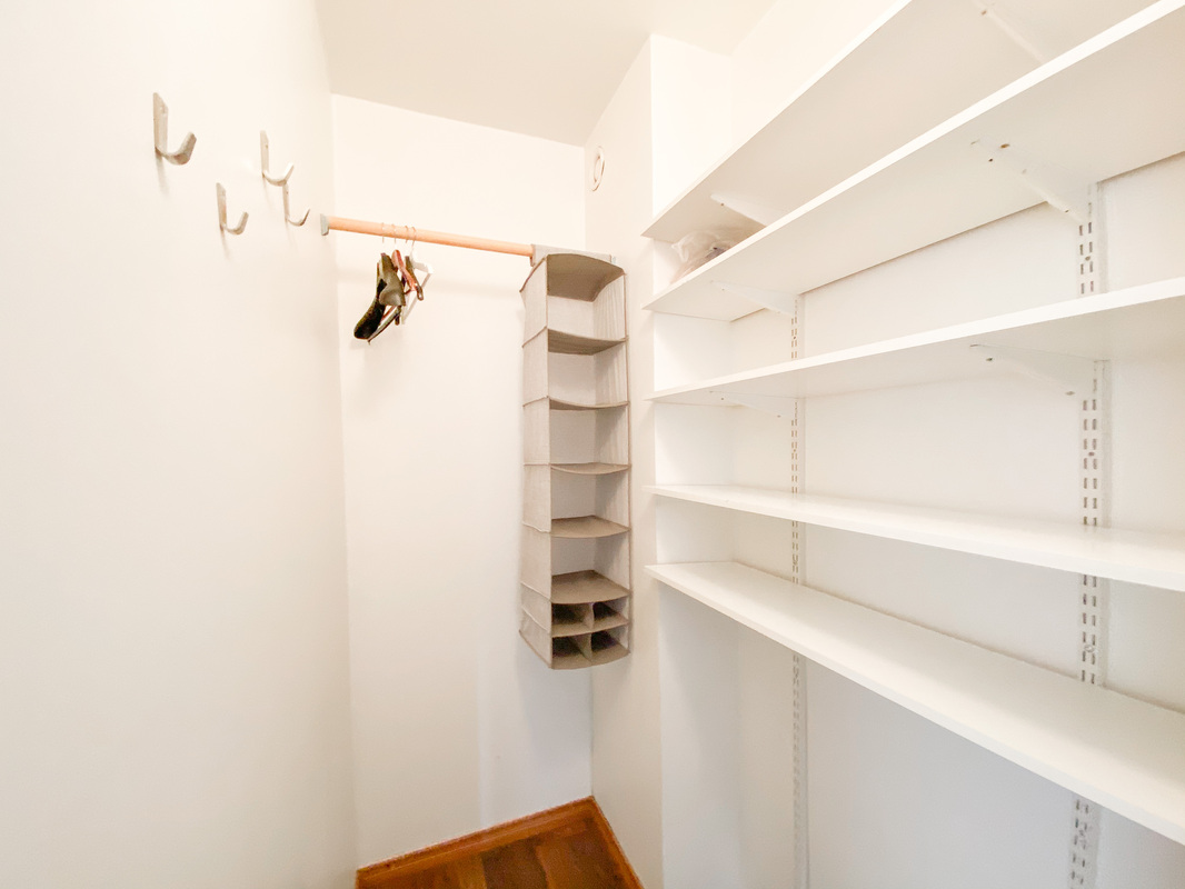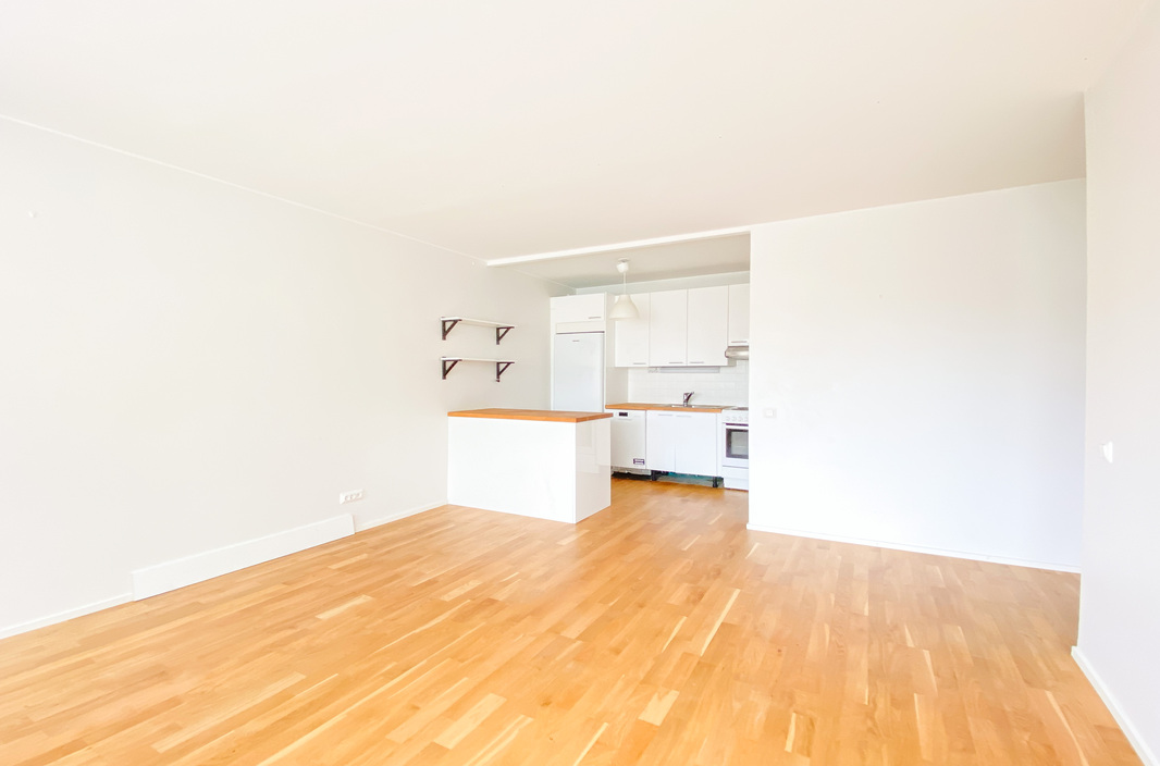 Sisään astuessa erillinen eteinen vaatehuoneineen tarjoaa erinomaiset puitteet säilytykseen. Eteenpäin jatkaessa vasemmalle jää suuri makuuhuone kaapistoineen ja asunnon perältä aukeaa valtava olohuone avokeittiöineen, jonka saareke jakaa käytännöllisesti luoden samalla niin lasku- kuin säilytystilaakin.