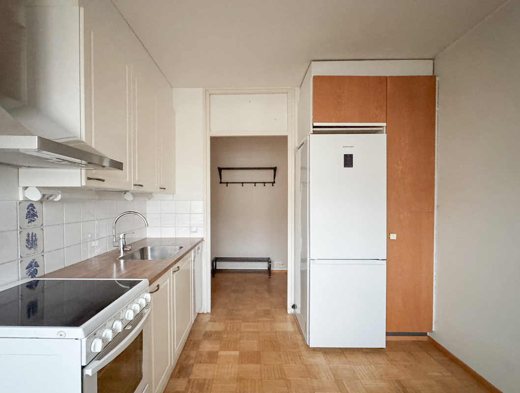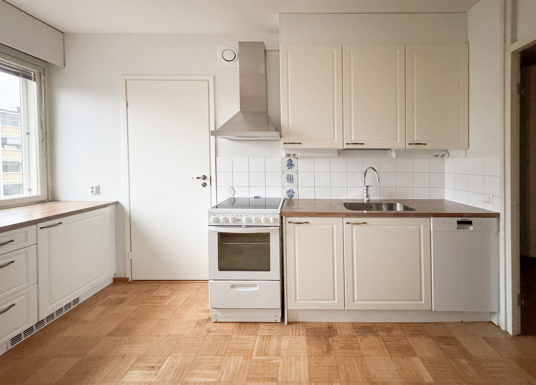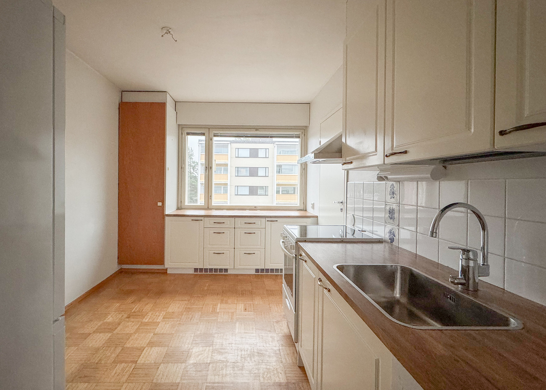 Erillisessä keittiössä on hyvin kaappi- ja laskutilaa, mikä tekee arjesta sujuvaa. Asunnon tunnelmaa lämmittää parkettilattia, ja säilytystilaa on runsaasti suuren vaatehuoneen ansiosta. Lisäksi makuuhuoneesta löytyy kaappitilaa. Kylpyhuone on remontoitu putkiremontin yhteydessä.