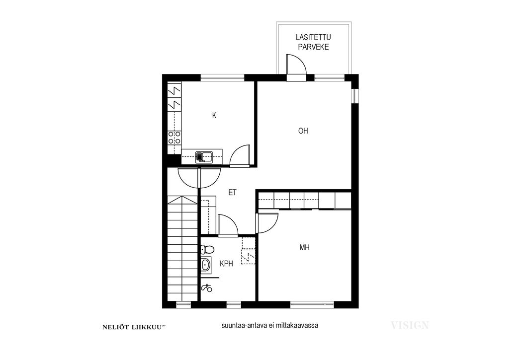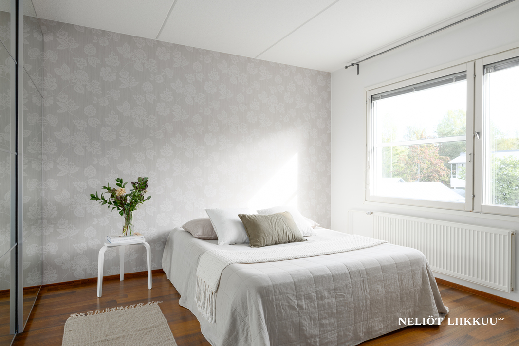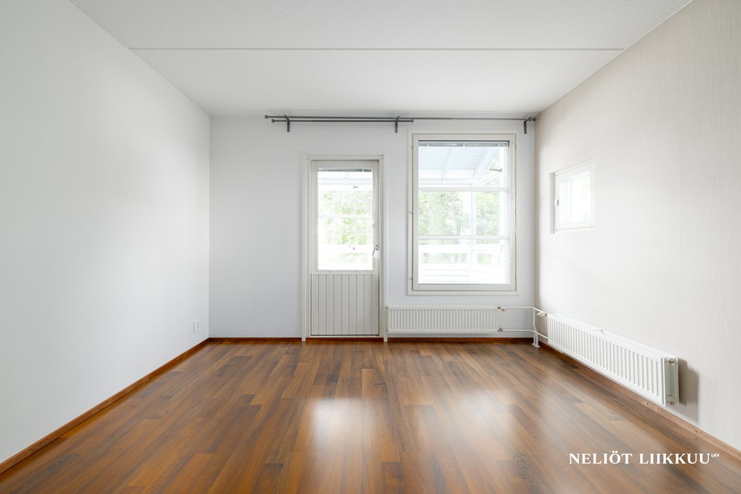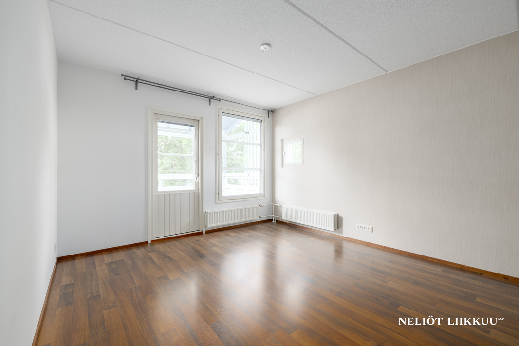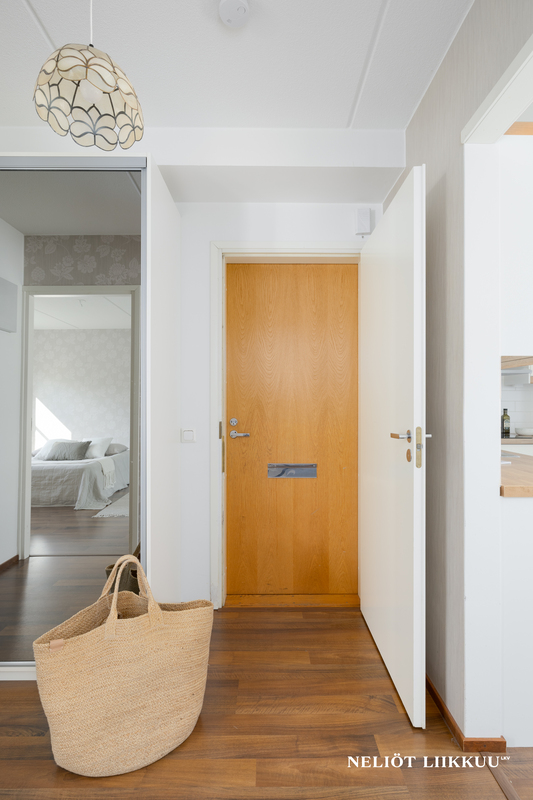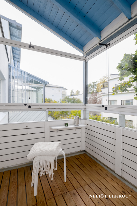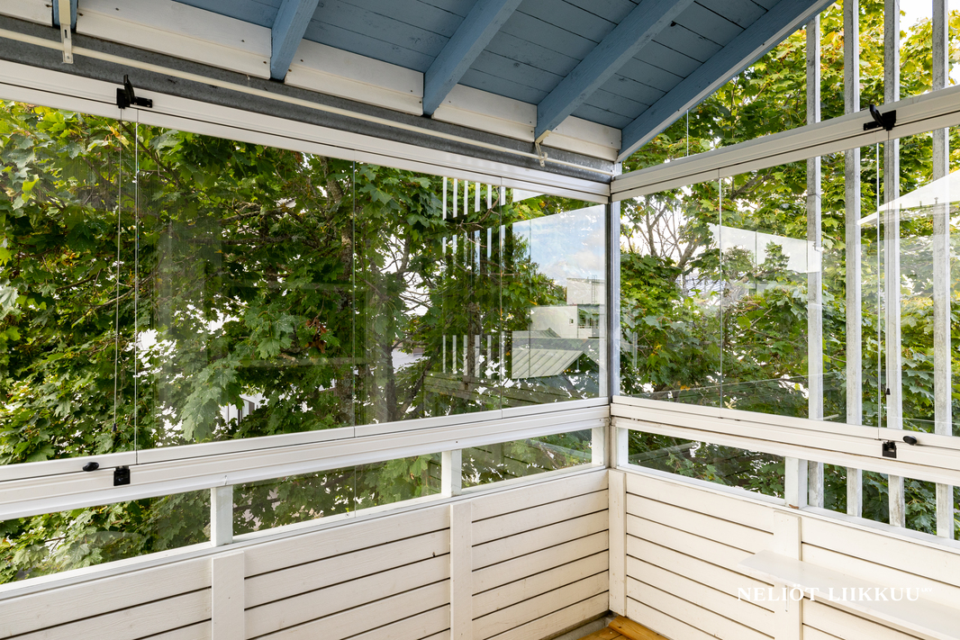 Tässä ylimmän kerroksen huoneistossa on erinomainen pohjaratkaisu: läpitalon huoneisto, iso makuuhuone, erillinen keittiö sekä tilava parveke. Olohuoneesta on käynti omalle parvekkeelle, josta avautuvat rauhalliset näkymät. Huoneiston alakerrassa ei ole asuinhuoneistoa, joten asunto on erittäin rauhallinen. Makuuhuone on kooltaan ideaali ja sinne mahtuu hyvin leveä parisänky. Säilytystilaa on runsaasti niin huoneistossa kuin häkkivarastossa . Keittiö on kunnoltaan hyvä, kotikokkailuun sopiva ja siellä on tilaa myös ruokapöydälle. Kylpyhuone on hyvässä kunnossa.