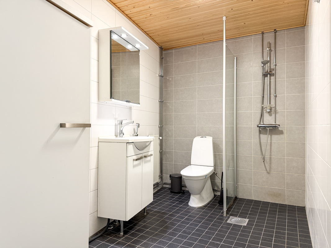 Kylpyhuone on tilava ja tänne mahtuu hyvin oma täysikokoinen pyykinpesukone.