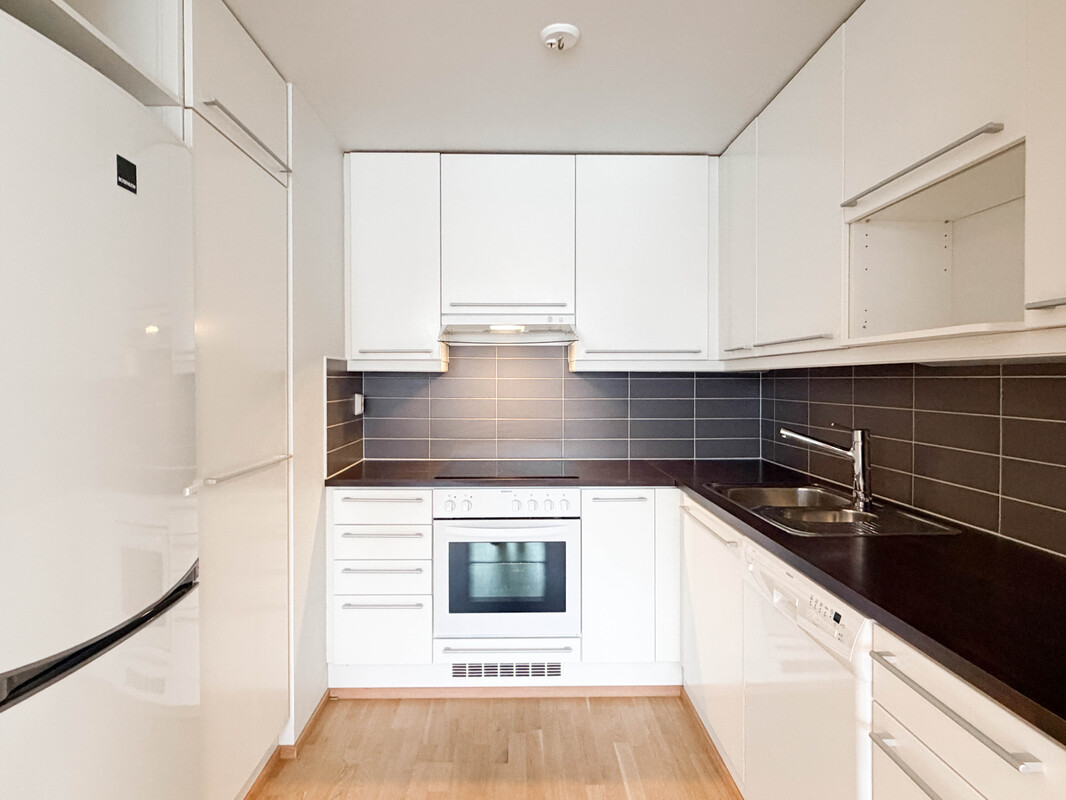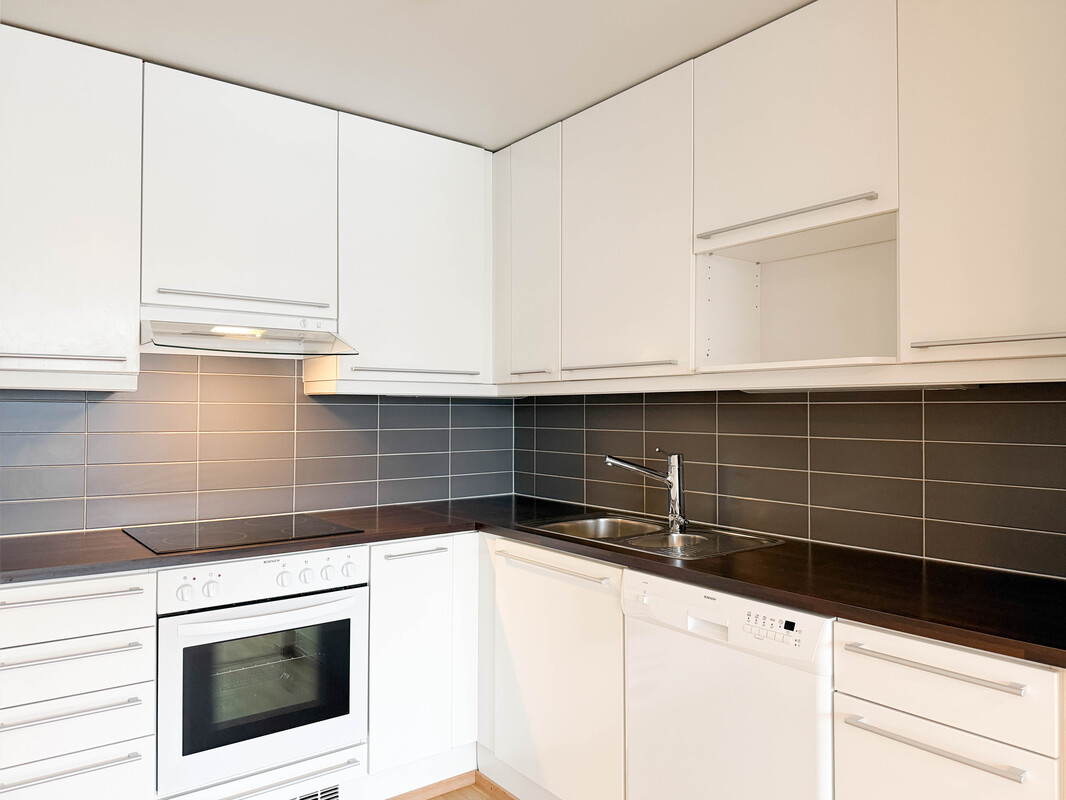 Hyvin varusteltu keittiö sulautuu luontevasti olohuoneeseen, josta on kulku lasitetulle parvekkeelle. Tilava parveke luo mukavasti lisätilaa asumiseen aikaisin keväästä aina pitkälle syksyyn.