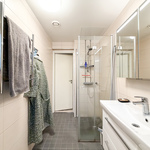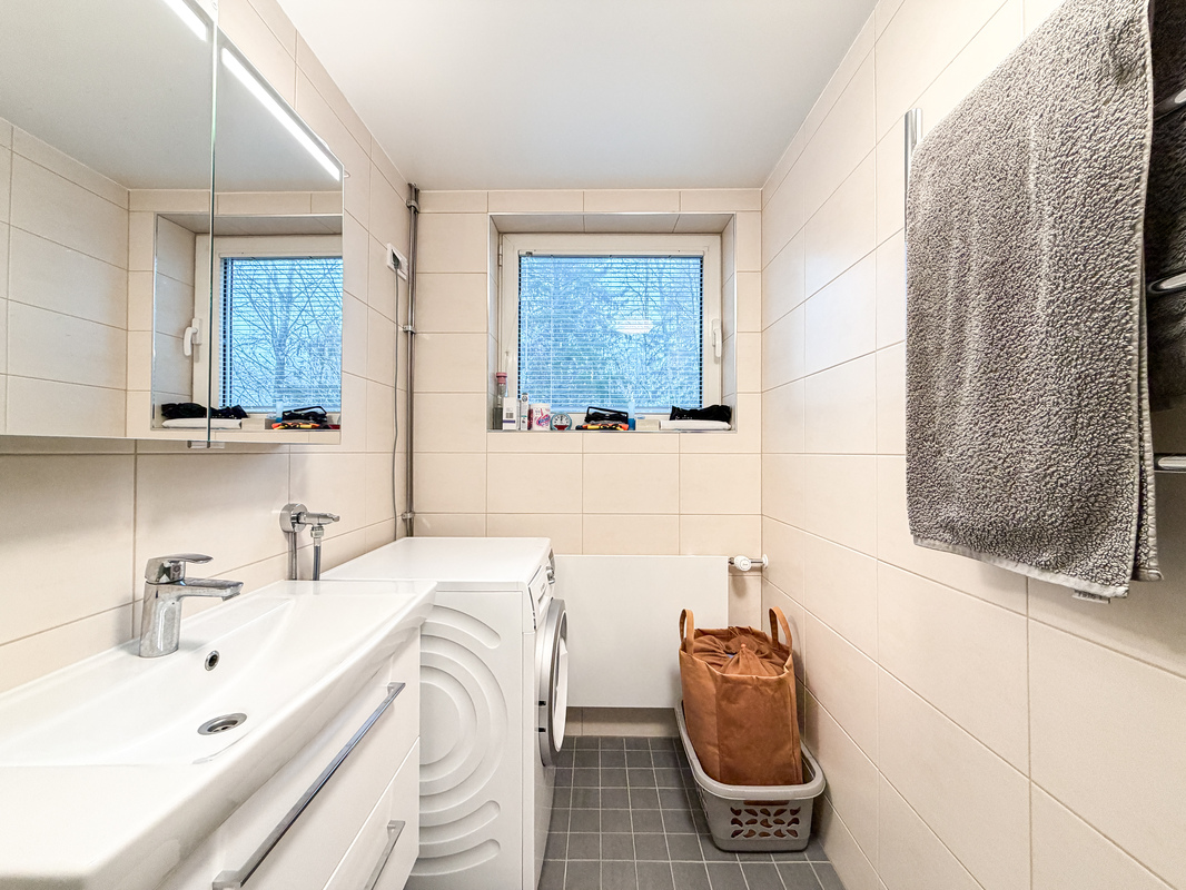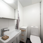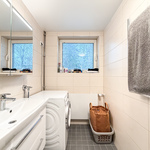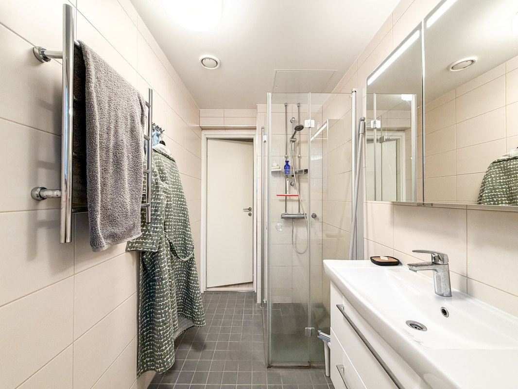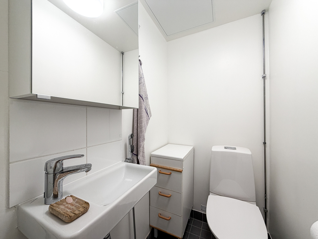 Tässä kodissa on erillinen wc sekä kylpyhuone, jotka molemmat remontoitu tyylikkäästi. Kylpyhuoneen puolelle mahtuu täysikokoinen pyykinpesukone.