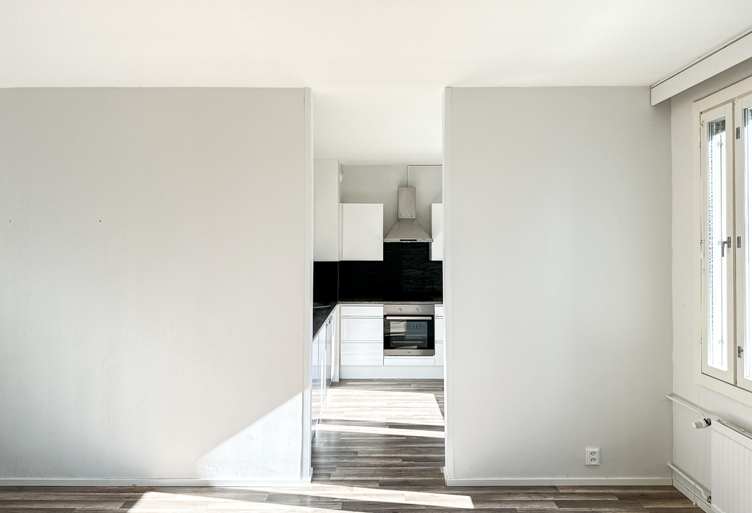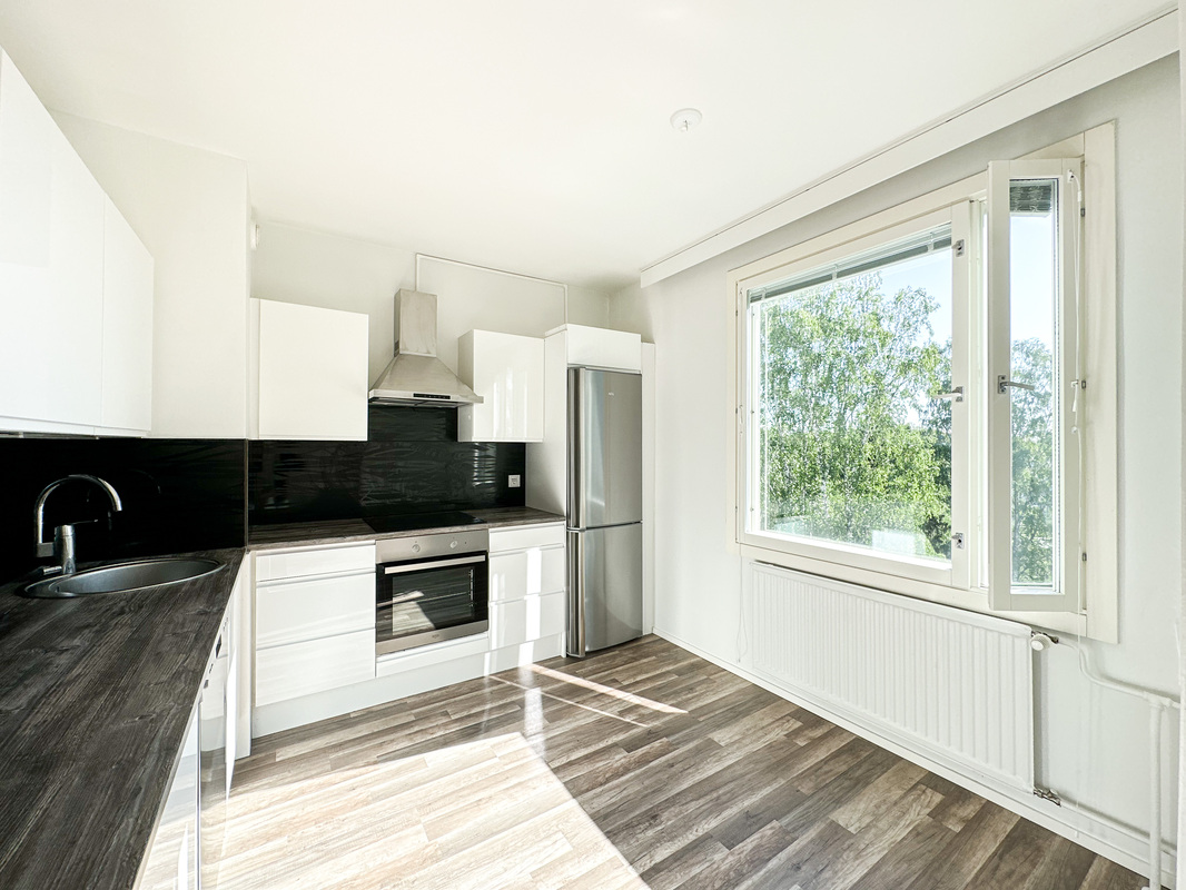 Tässä kodissa on avara ja selkeä pohjaratkaisu eikä hukkaneliöitä ole. Olohuone on avara ja näkymät sekä olohuoneesta, että keittiöstä ovat vehreät. Keittiö on moderni ja täältä löytyy kaikki tarvittavat varustelut kuten astianpesukone. Kodinkoneet ovat tyylikkäät ja lasku,- sekä kaappitilaa on hyvin. Keittiönpöytä mahtuu hyvin myös keittiön puolelle.