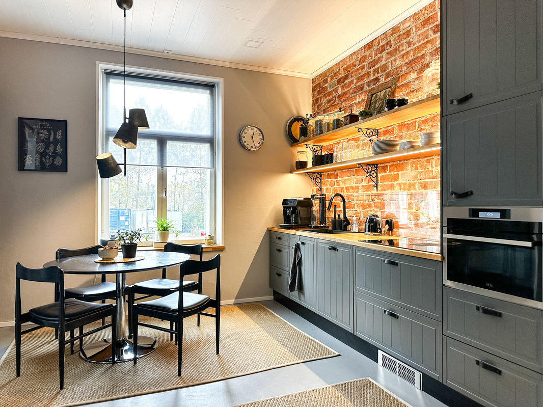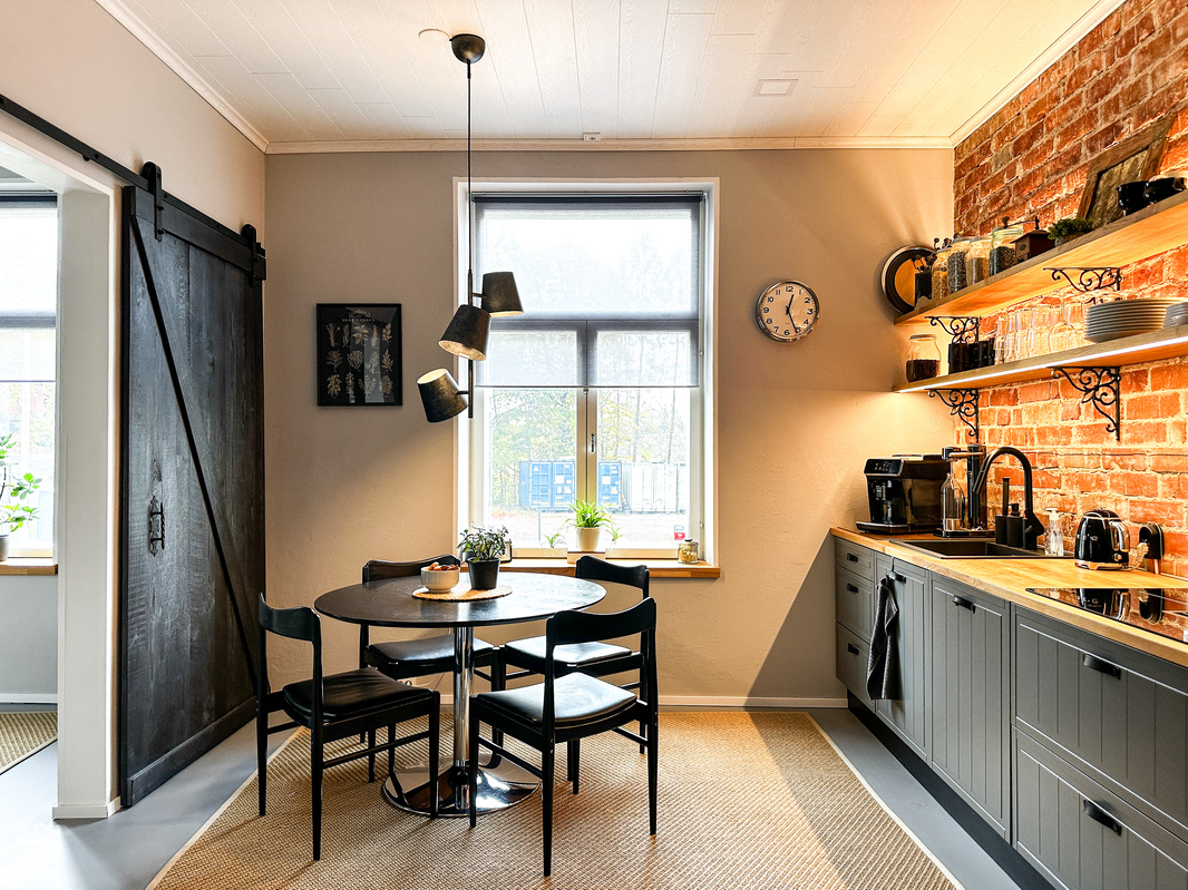 yhteiskäytössä oleva keittiö alakerran toimiston kanssa
