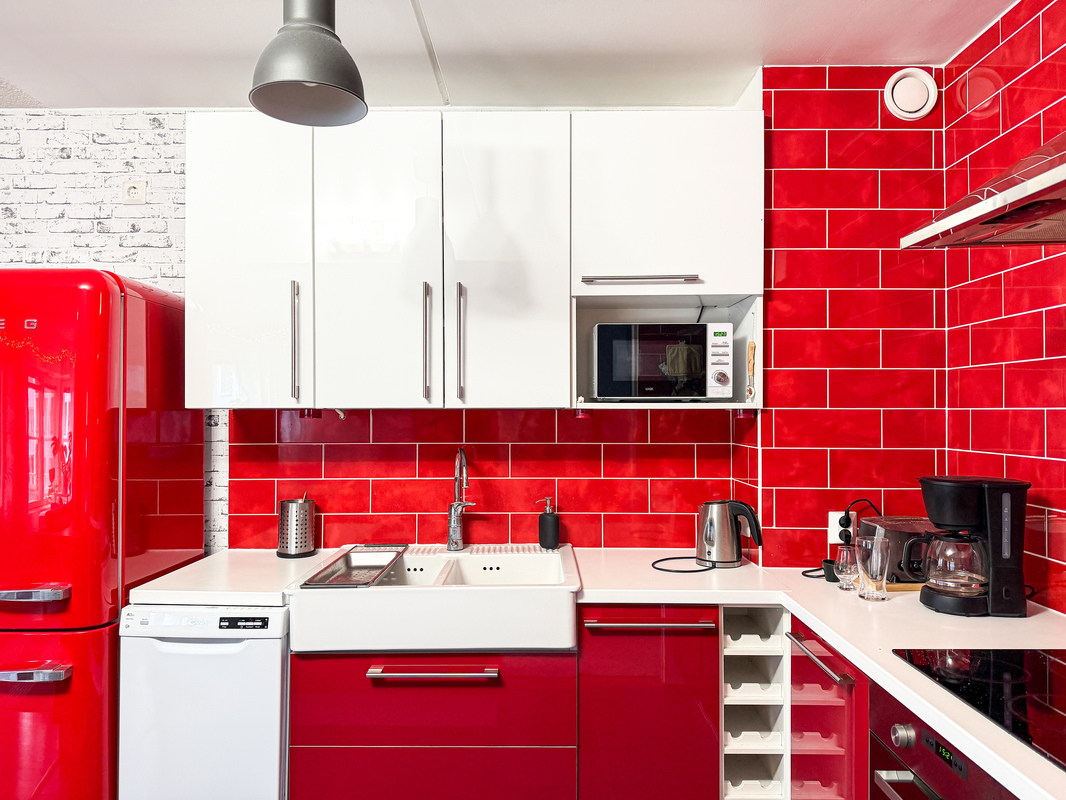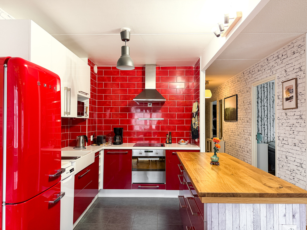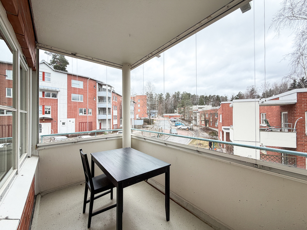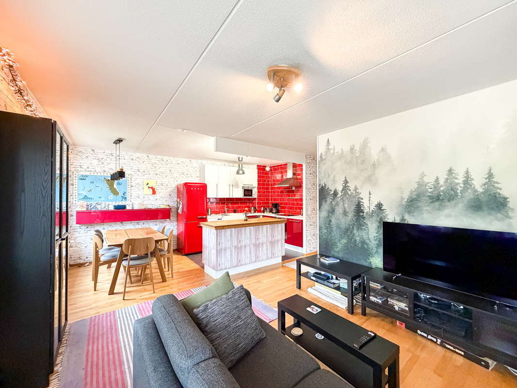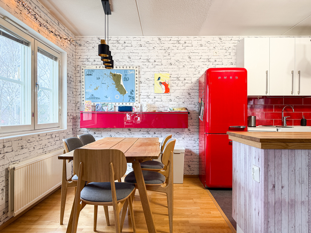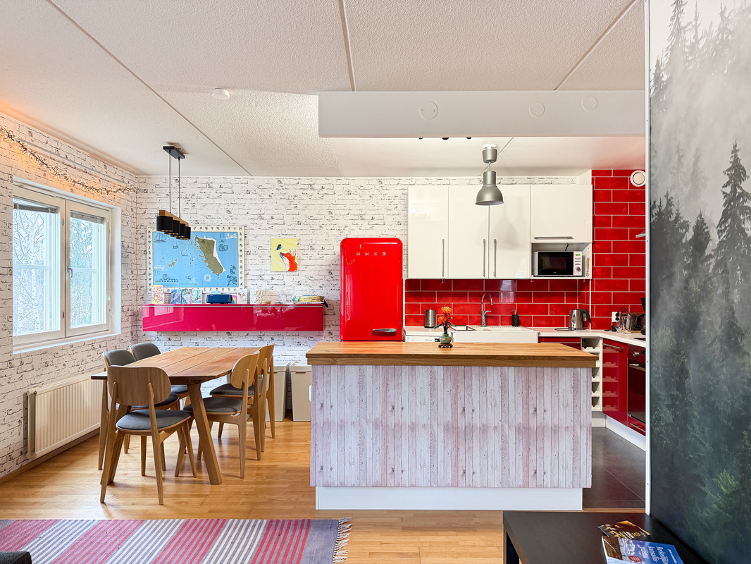 Olohuone ja keittiö ovat yhtä avaraa tilaa ja persoonallinen punainen keittiö koristaa tätä tilaa. Keittiön puolelle mahtuu hyvin ruokapöytä ja kätevä saareke tuo hyvin laskutilaa keittiön puolelle. Kaikki tarvittavat varustelut myös löytyvät. Olohuoneesta on kulku tilavalle lasitetulle parvekkeelle, joka toimii hyvin tilan jatkeena heti näin aikaisesta keväästä pitkälle syksyyn.