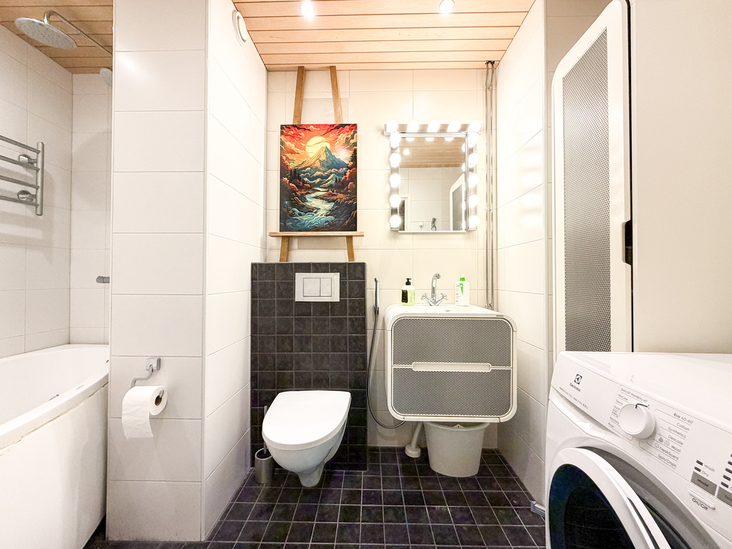 Kylpyhuone on moderni sekä tyylikäs. Tämän kruunaa poreamme, joka tuo pientä luksusta arkeen.
