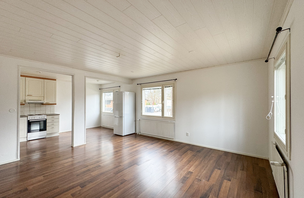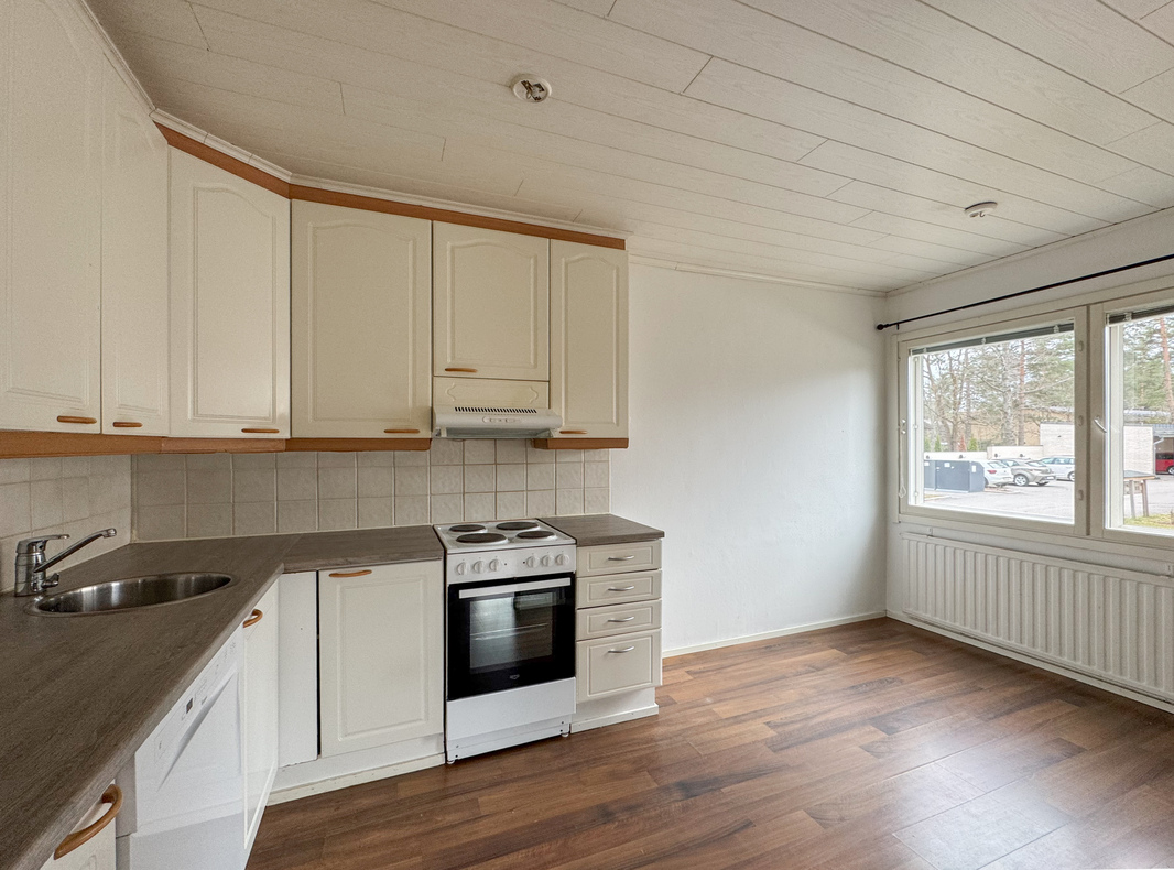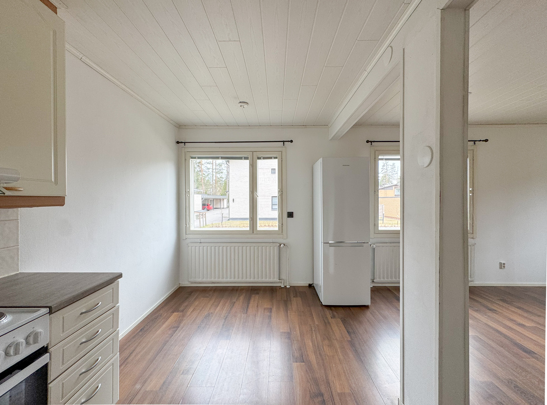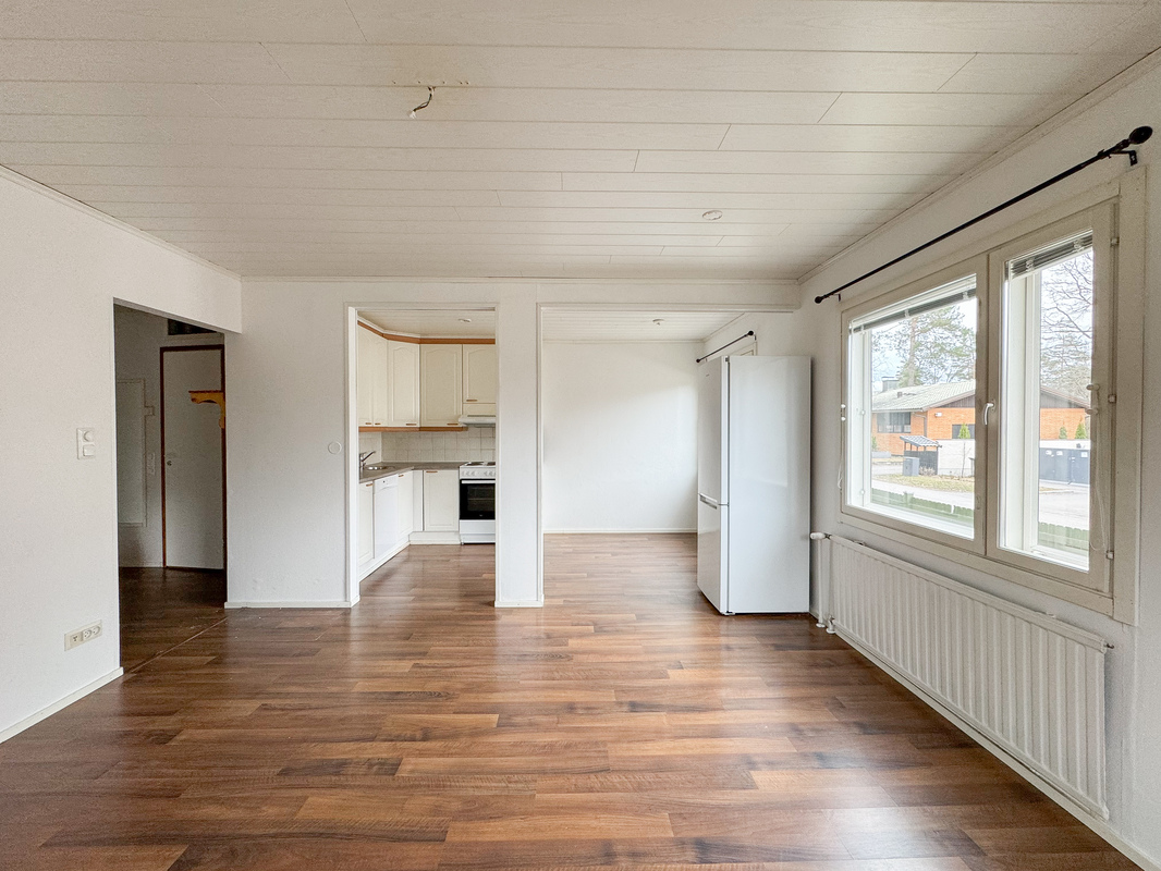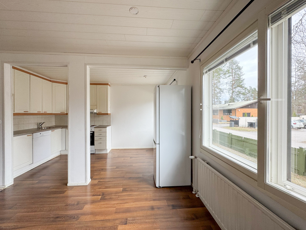 Tämä idyllinen kokonaisuus tarjoaa toimivan pohjaratkaisun ja miellyttävän asumisympäristön. Asunnon keittiö ja olohuone muodostavat avaran ja yhtenäisen tilan, joka kutsuu viihtymään. Hyvin varustellusta keittiöstä löytyy astianpesukone sekä runsaasti kaappi- ja laskutilaa arjen sujuvuuden tueksi.