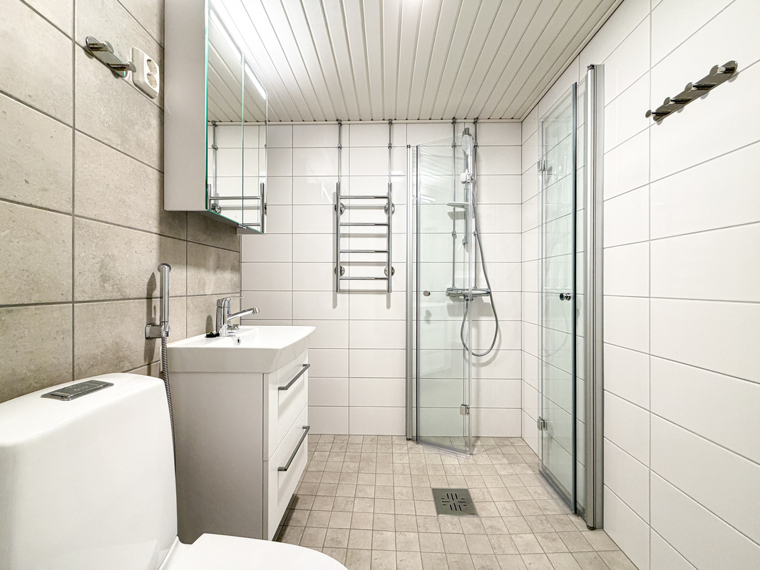 Kylpyhuone on tyylikäs ja juuri remontoitu putkiremontin yhteydessä. Pinnat ovat siis täysin uudet.