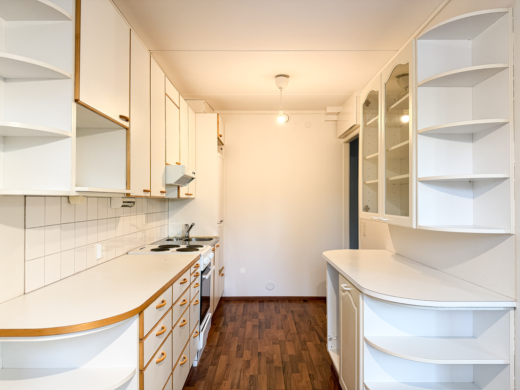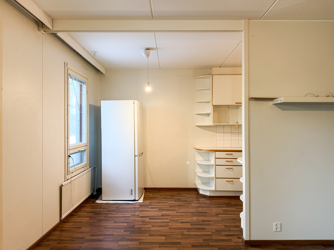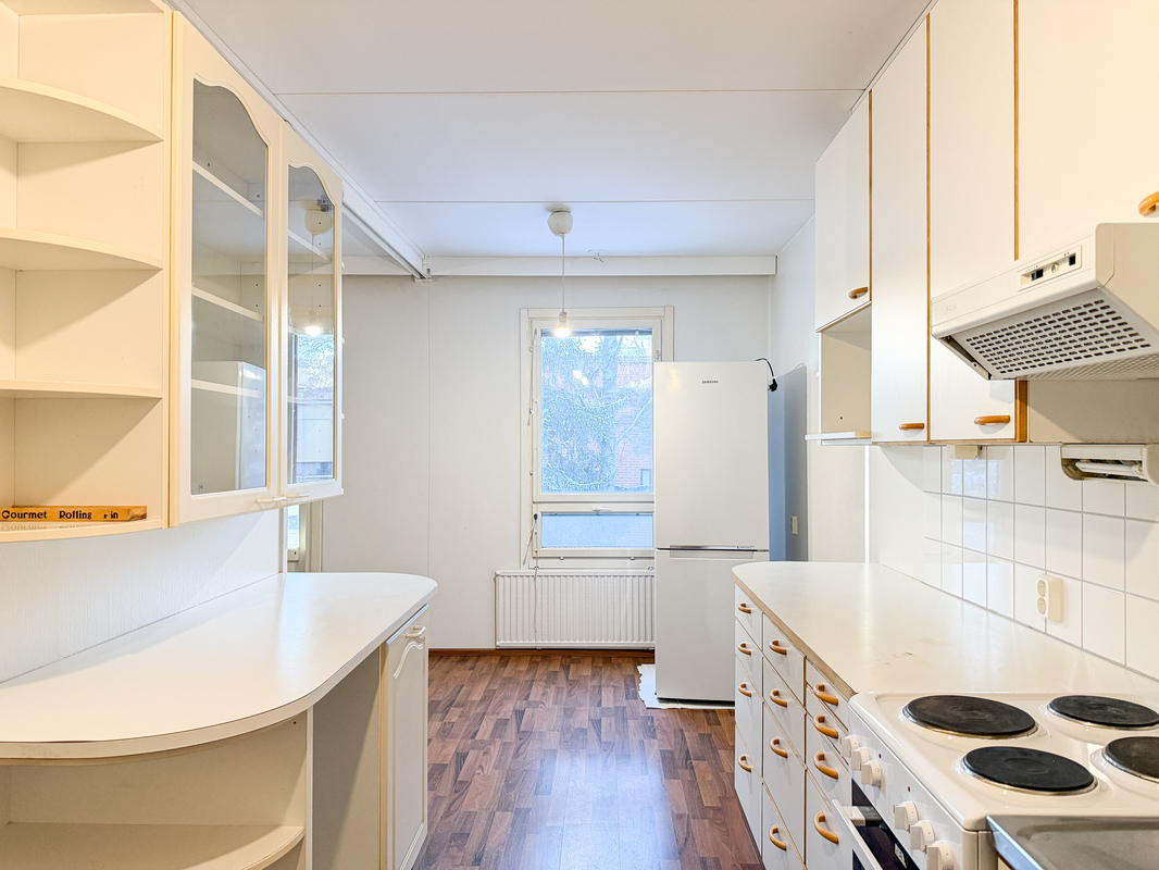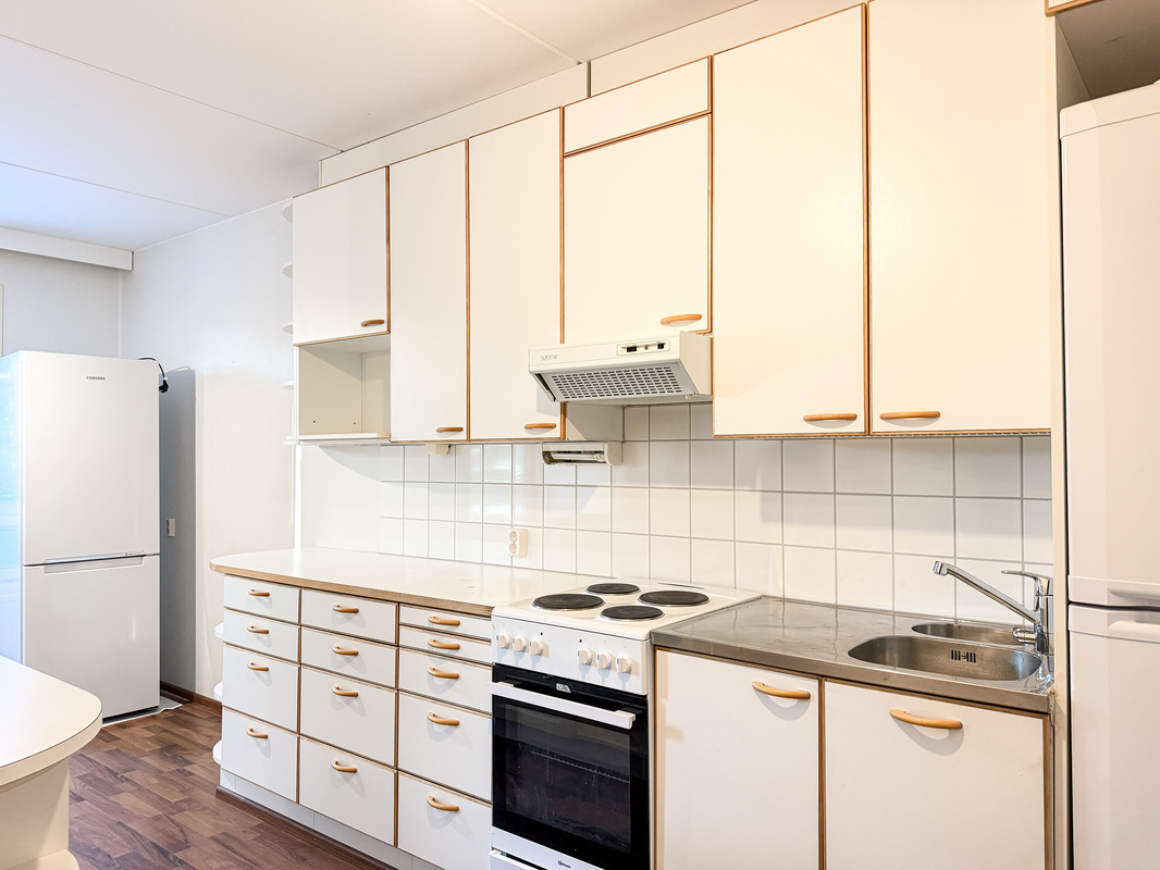 Tässä kodissa on hyvä pohjaratkaisu ja tilavat huoneet. Keittiö on siistikuntoinen ja täällä on hyvin lasku,- sekä säilytystilaa. Keittiöön mahtuu lisäksi keittiön pöytä ikkunan eteen.