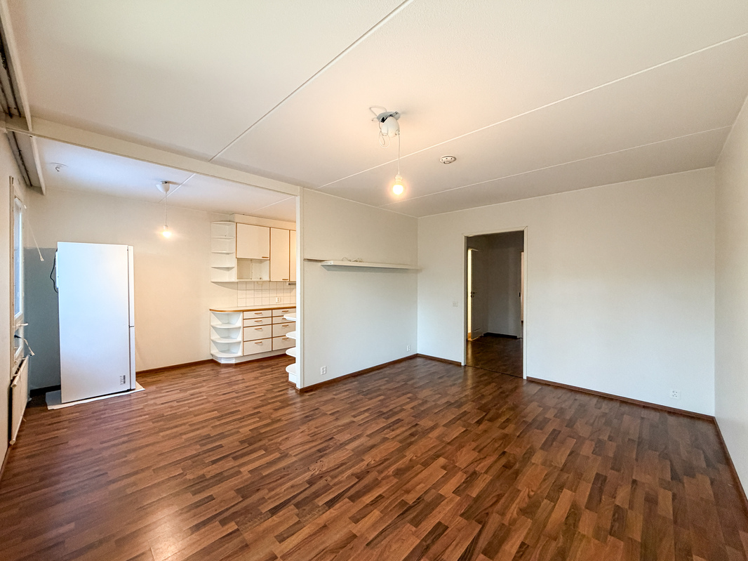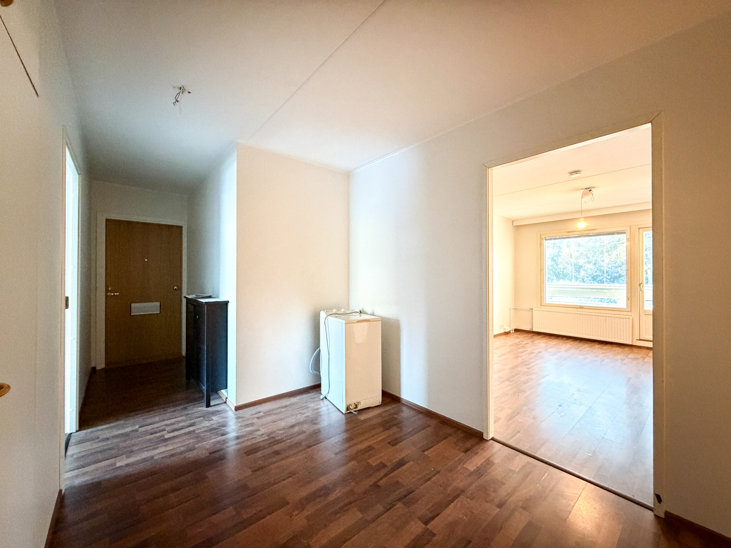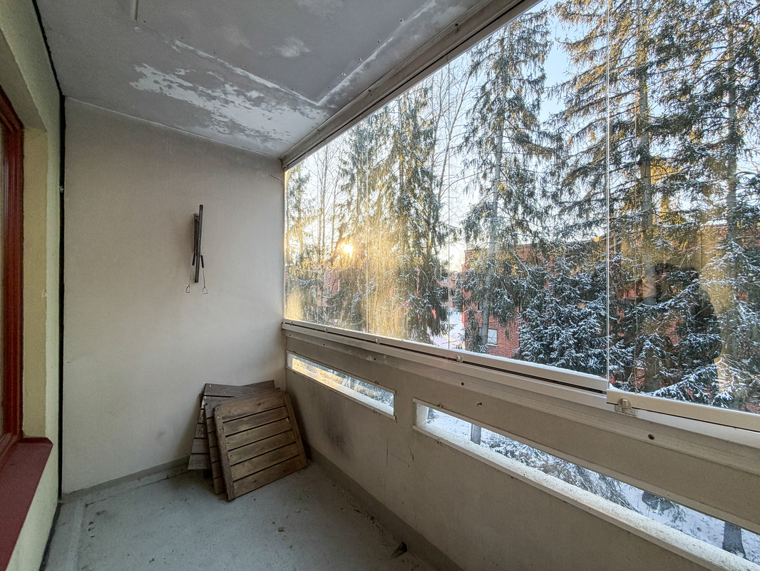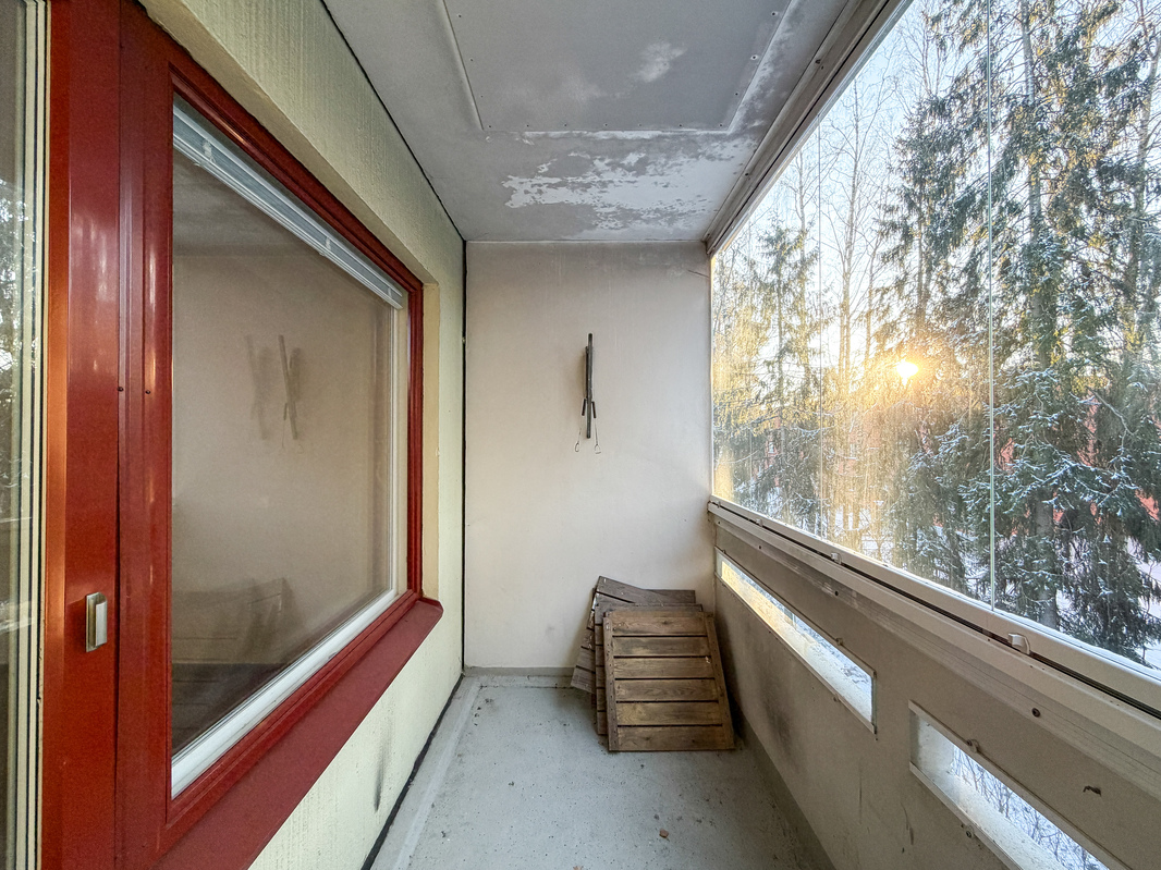Olohuone on avara sekä tilava ja huoneesta on kulku lasitetulle parvekkeelle. Näkymät parvekkeelta ovat vehreät, eikä naapureita ole vastassa.
