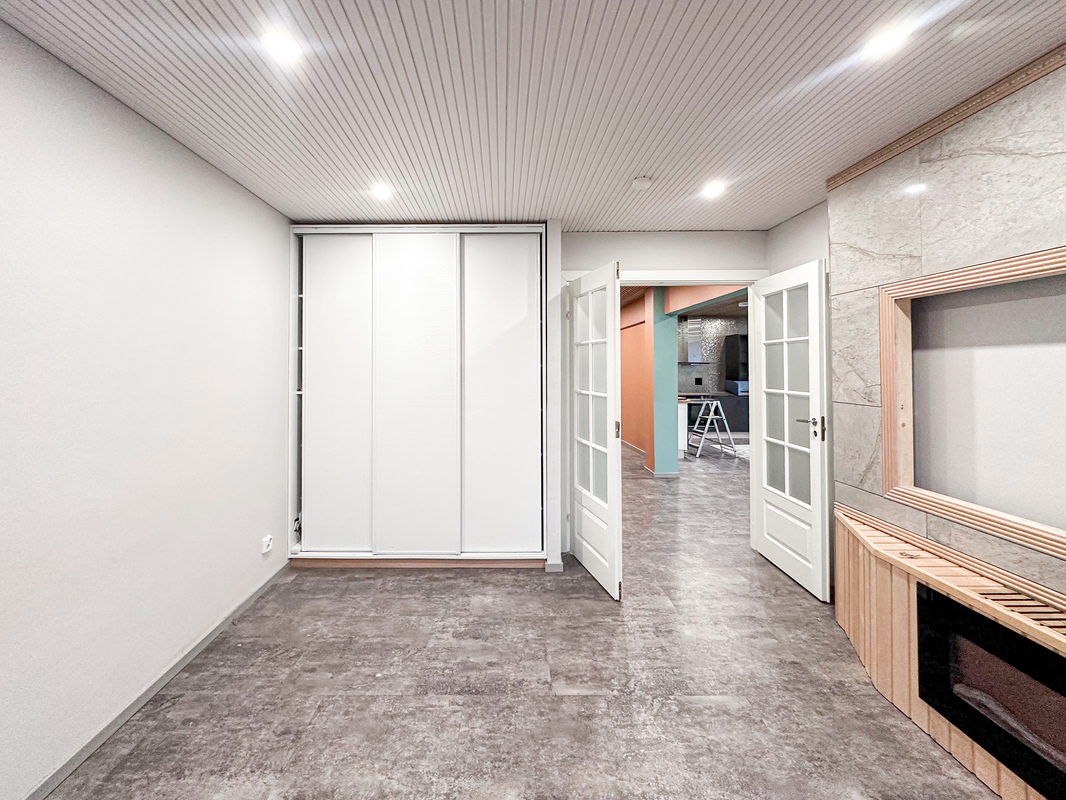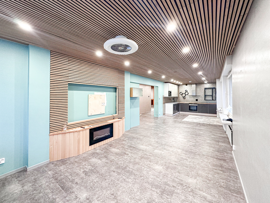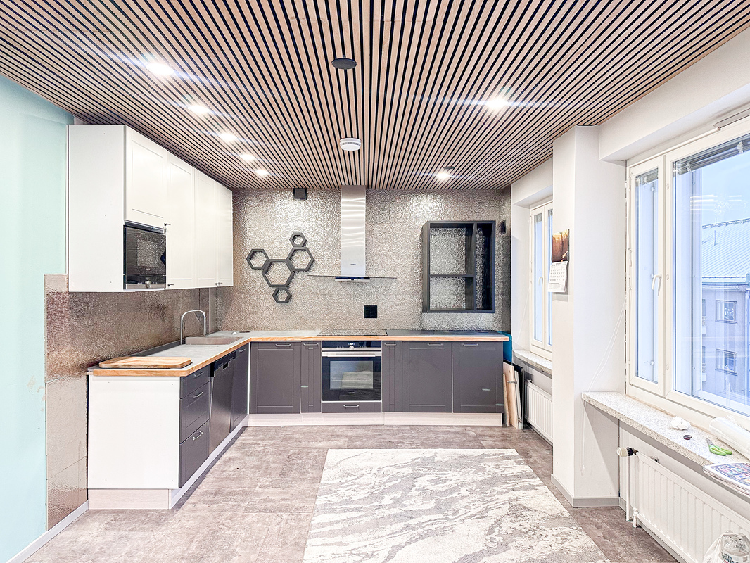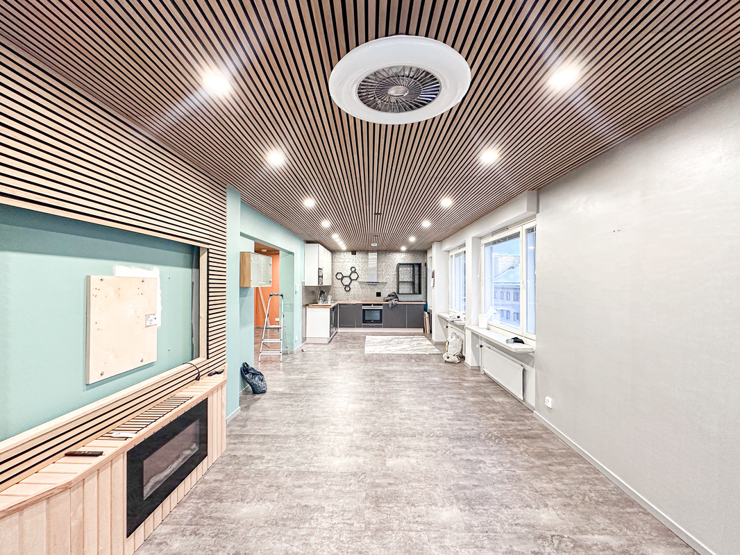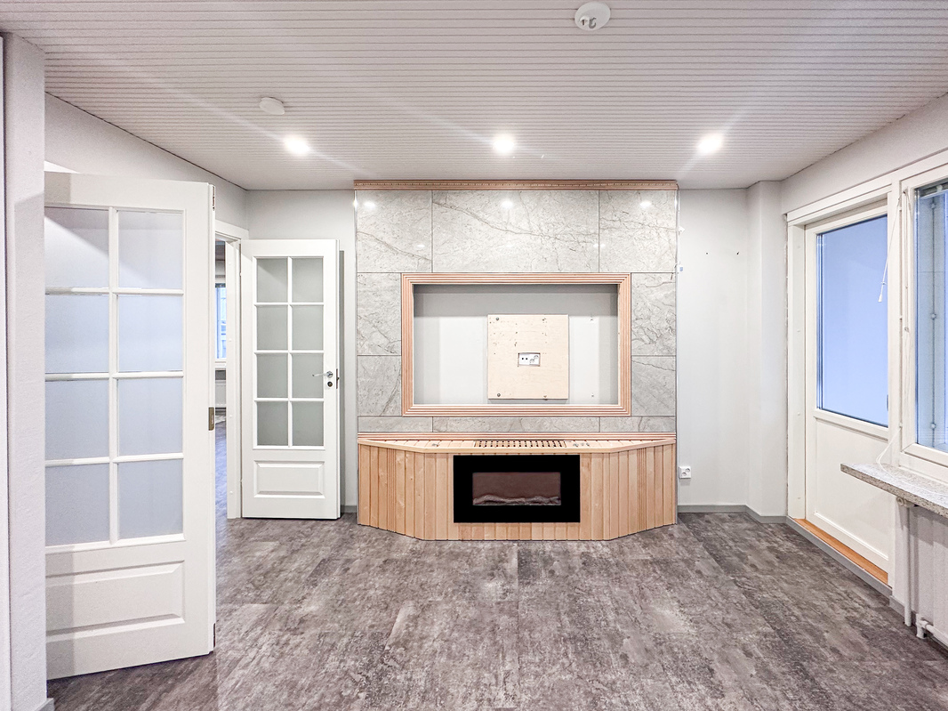 Trendikäs avokeittiö yhdistyy luontevasti ruokailutilaan ja tilavaan olohuoneeseen, joka sijoittuu talon kulmaan ja tarjoaa runsaasti luonnonvaloa. Olohuoneen tunnelmaa viimeistelevät sähkötakka ja akustiset seinäpaneelit, jotka luovat kodikkaan ja rauhallisen kokonaisuuden.