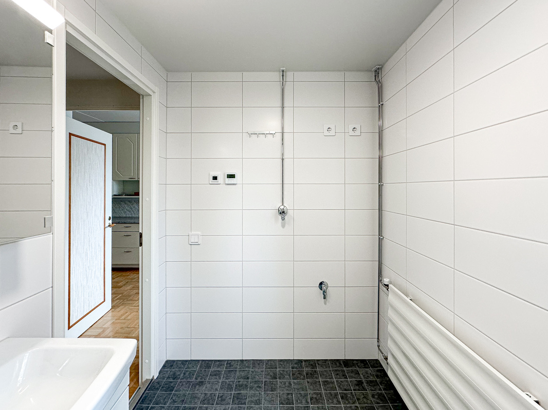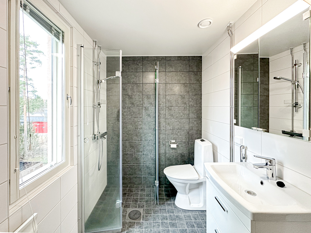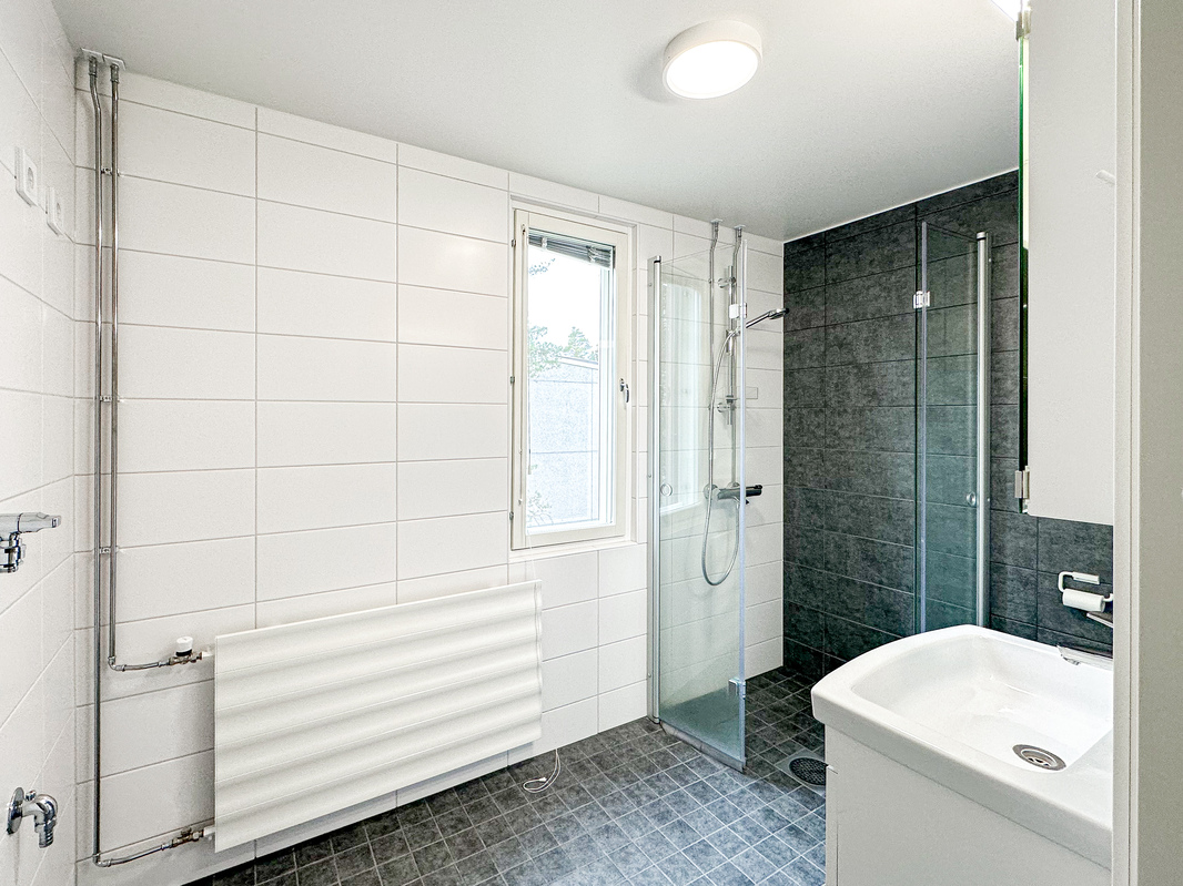 Kylpyhuone on nykypäiväinen ja siellä on luonnollisesti paikka omalle pyykinpesukoneelle ja arkea helpottaa erillinen wc. Säilytystilaa löytyy mukavasti, erityisesti erillisen vaatehuoneen ansiosta.