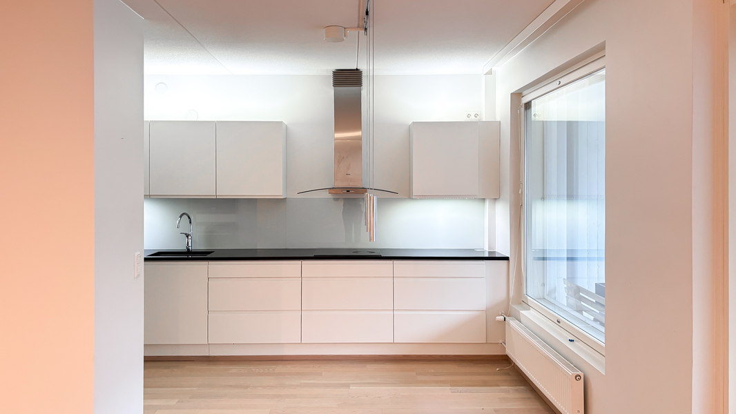 Asunnon sydän on moderni keittiö, joka avautuu vaivattomasti suureen ja valoisaan olohuoneeseen. Keittiöstä löytyy kaikki tarvittavat kodinkoneet, kuten mikro, astianpesukone sekä täysimittaiset jääkaappi ja pakastin. Olohuoneen tyylikkäässä valokiskossa yhdistyy käytännöllisyys ja tunnelma, ja suurelta lasitetulta parvekkeelta voi nauttia upeista merimaisemista.