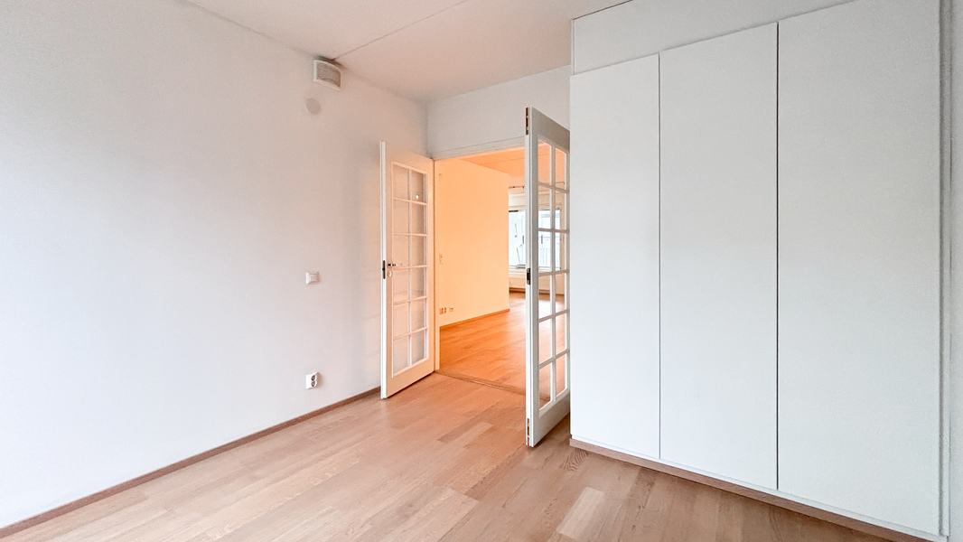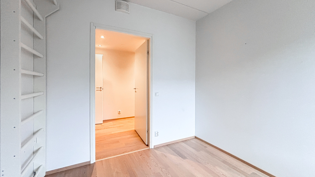 Sisäänkäynniltä avautuu pitkä käytävä, jonka varrella on peilikaapilla varustettu eteinen. Käytävän oikealla puolella sijaitsevat kaikki makuuhuoneet. Tilavat huoneet tarjoavat joustavia ratkaisuja: kaksi suurempaa huonetta on varustettu kiinteillä kaapeilla, ja pienin makuuhuone sopii erinomaisesti lasten huoneeksi tai työtilaksi.