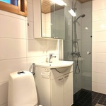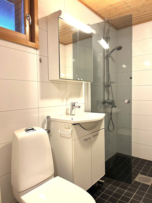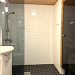 | Kylpyhuoneen kuvaus | Suihku, wc-istuin, pesukoneliitäntä. Bideesuihku. Allaskaapisto. Peilikaappi. Suihkuseinä. Kiinteät valaisimet. Lattiat ja seinät laattaa. |